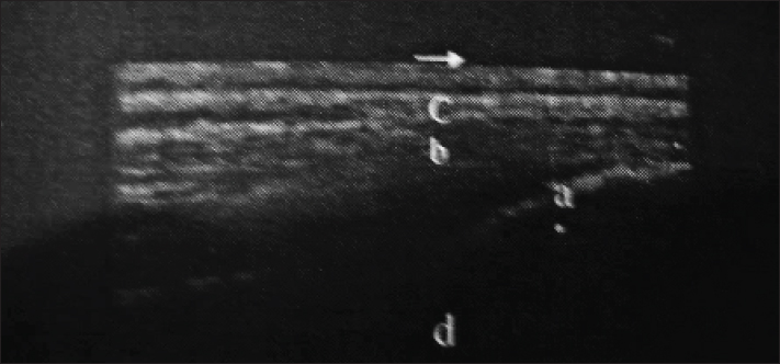 Fig. 3. Longitudinal ultrasongraphy at the sacro-iliac region (a-the dorsal sacroiliac ligament, b-longissimus dorsi tendon, c-gluteal fascia, and d- sacral tuber).