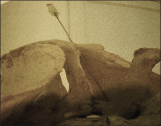 Fig. 4. Bony components of the sacropelvis illustrating sacroiliac needle position. E. Diagnostic injection1. Interspinous injection A local analgesic injection of 5 ml of MepivacaineR, 2% (Alexandria, Egypt) was performed in the interspinal space between the painful spinous process. The results were assessed after 15 minutes. 2. Sacroiliac joint (SIJ) injection For accurate accessibility of SIJ, 3 transverse sections at the sacral region of the back (as anatomical cadavers specimens intended for dissection) and an osseous construction pf sacro-pelvic specimen were used to test the feasibility of injection in a predetermined anatomical location (Fig. 4). Forty horses with suggestive SIJ complaints were used to evaluate the potential of diagnostic SIJ analgesia based on previous anatomical studies. Following restraining the horse in stanchion local aseptic preparation of the sacral region, A 13 cm, a 21-gauge needle was inserted axially to the cranial aspect of the ipsilateral sacral tuber according to the rider’s complaint side of the horse (left or right). The needle was directed obliquely and caudally at 30º to the vertical of the same side toward the SIJ. The needle was then advanced until contact was made with the bony floor formed by the sacral spine and medial iliac wall of the SIJ. Twenty milliliters of MepivacaineR, 2% were perfused in the vicinity while the needle was partially withdrawn to walk the horse for 15 minutes after injection before being assessed and ridden. ManagementThe following management and treatment protocols were adopted in the present cases of affected horses: Rest periods from 1 to 3 months, according to severity, in a loose box or stall, combined with reduced feed quantity were established in all affected cases. NSAID IV PhenylbutazoneR 4.4 mg/Kg/ day b.i.d for 5 days or descending oral administration 4 mg/day for 4 days, 3 mg/day for 4 days, 2 mg/day for 4 days, and 1 gm/day for 8 days were used to reduce pain. Patients with positive interspinous and SIJ injection analgesia were injected with therapeutic intra-articular tamacinolone acetonide, 40 mg (KenacortR Squib, SmithKline Beecham, Egypt) combined with 20 ml Mepivacaine local analgesic (2%). Statistical analysisThe recorded data were analyzed using Prism (GraphPad Software, Boston MA02110, USA). Relationship between the breed of the horses and the confidence interval frequency of the type of back injury. Ethical approvalEthical approval was not obtained because the study was considered routine hospital work. ResultsExamination of the remaining horses demonstrated scoliosis, hunter bump, quarter muscular asymmetry, and sacral or coxal tuber asymmetry in 2, 1, 19, and 30 horses, respectively. Back skin lesions as saddle marks, lumps, or scars were seen in 9 horses. Palpation by running the hands with pressure over the back for detection of tenderness, reluctance, or discomfiture showed great significance for locating the seat of trouble in approximately 50% of the presented cases. Rectal examination demonstrated (8 cases–8%) pelvic bony callus, iliac shaft asymmetry, and lumbar spondylosis. At exercise, hand walking showed the hind limb restricted movement, plaiting, and imbalanced walking with restricted vertebral or pelvic mobility (raised head and arched back) in the majority of the patients. Lunging for 15 minutes showed stiffness and poor hind limb impulsion in 15 cases (20%). Marked imbalance and coordination with tail swishing were noted when action was changed from trot to canter in 44 cases (58.66%). When ridden, the backs of 32 horses were sunken during mounting or girth tightening. Short turning was accompanied by a raised head and arched back in 20 cases. Jumping mistakes or refusals, particularly many fences, or fences over 3 feet with marked changes of the jumping stile, reluctant sliding stops, or backing were noted. The results of the regional motion test by active lateral flexion—bending range of motion for the neck and trunk, assisted range of motion test showed variable reactions and reached and spinal reflexes for the saddle and croup regions were found important for conventional assessment of back disorders as 45 cases (60%) showed an inability to elevate the trunk. Fifty three cases (70.6%) exhibited hind limb lameness manifested as restriction of movement combined with poor hock joint flexion and a tendency to drag the toe of one or both hindlimbs. Diagnostic imaging by radiographic examination was limited to identifying overriding thoracic dorsal vertebral spinous processes using an output of 20 mA at 90 kV within 0.1 second. However, most projections suffer from superimposition of the lungs and poor resolution. Ultrasonographic examination of the thoracolumbar dorsal spines and sacroiliac region revealed 30 cases with sacroiliac pain or injuries with heterogenic echogenicity and thickening of the dorsal sacroiliac ligament, 16 cases with dorsal spinous desmopathy, and 8 cases with echogenic changes of longissimus dorsi aponeurosis (Fig. 5). As the used horses were of different breeds, a comparison was made in the rate of back injuries among them to determine the breed most affected and the most common injuries as well. The following graph illustrates the generated descriptive individual clinical recorded data among different breeds of presented horses (Fig. 6).