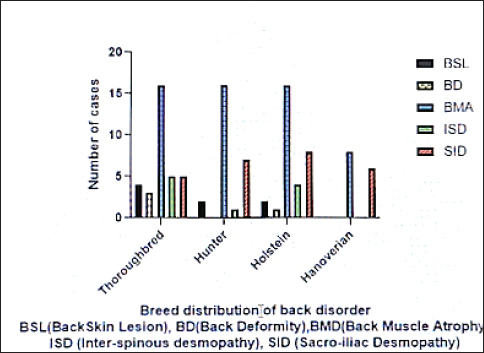 Fig. 6. The descriptive clinical recorded data among the different breeds of the presented horses. Diagnostic interspinous and sacroiliac analgesic injections were confirmatory in 40 patients with sacroiliac pain since marked improvements in gait and performance were observed. Treatment consisted of sufficient stall rest with mild walking for all patients (range: 1–3 months). Six cases of saddle lesions were managed with intensive skin care, perfect padding, and fitting of saddles. Intravenous NSAIDs to control pain at a dose rate of 4.4 mg/Kg b.i.d. for 5 days in mild cases (11 cases) and for 30 days in chronic cases (7 cases). DiscussionThe present study has achieved its aims by increasing the knowledge of back pain in athletic horses and allowing equine practitioners with limited equipment opportunities to manage such problems. It has been suggested that Back disorder is a major cause of poor performance in athletic horses (Jeffcott, 1980; Landman et al., 2004; Dyson, 2016; Mayaki et al., 2019). The condition is mostly attributed to some essential predisposing reasons, which include faulty tacking, poor training, rider overweight, unequal distribution of the rider’s weight, improper shoeing, low-quality feeding, and poor management. In the present study, the conventional diagnosis of back pain in horses, including anamnesis, clinical examination at rest and exercise, special back pain assessment tests, diagnostic imaging, and local analgesic injection, is indispensable and reliable in equine veterinary clinics. Analogous protocols have also been used (Jeffcott, 1993; Landman et.al., 2004; Kent Allen et al., 2010; Findley and Singer, 2015). Modern diagnostic modalities such as nuclear scintigraphy or CT, thermography, and electromyography are promising for the diagnosis of difficult cases; however, they are available in well-equipped equine clinics (Peham et al., 2001; Zimmerman et al., 2012; Burns et al., 2018). From the history, the etiology revolved around incorrect saddle, rider, or training, back mal-conformation, muscular strain, osteopathy of the spinous processes, and desmopathy of the interspinous or sacroiliac ligament. Several studies have reported similar reasons (Turner, 2011; Greve and Dyson, 2014; Clayton and Stubbs, 2016; Mayaki et al., 2019). Clinically, musculoskeletal dysfunction using the lateral bending and flexion range of motion ALBRM, AFRM and spinal reflex tests were assessed successfully and proved efficient for grading the lateral and dorsal vertebral flexions. Similar results have been reported in other studies (Martin and Klide, 1987). A system for motion analysis (expert vision system) was used in other studies (Licka and Peham, 1998) after placing markers and cameras to assess the spinal movement in maximum arching, dipping, and left and right flexion by measurements. The majority of the patients (70.6%) exhibited signs of hind limb lameness. A high prevalence of lameness has been reported in other studies (Cauvin, 1997; Landman et al., 2004). In the present study, ultrasonography of the interspinous and sacroiliac ligament was helpful in the diagnosis of 30 cases (40%) being diagnosed with sacro-iliac desmopathy. Furthermore, intraspinous or sacroiliac, local analgesic injections were considered effective diagnostic tools. Here, it is important to pay considerable attention to this joint during the examination as it may be the origin of the problem. These results are consistent with those of other studies (Engeli and Haussler, 2011; Dyson and Murray, 2003). Conservative treatments using non-steroidal anti-inflammatory agents combined with rest, correction of the saddle, compression, and massage therapy were used with non-eventful recovery. Peri-articular injection of corticosteroids with local anesthetic gave satisfactory results in positive cases of sacro-iliac desmopathy. Similar treatment protocols have been reported (Turner, 2011). Sacro-iliac desmopathy was highly prevalent among the presented cases while interspinous desmopathy came next. In this respect, racehorses and showjumpers are more prone to enthesophytosis of the spinous processes desmopathy of the interspinous ligament (Clayton and Stubbs, 2016). Thoroughbred jumper horses showed a high frequency of back disorders of all types, followed by Holsteiner and hunter-jumpers, while the Hanoverian showed the least frequency. Back muscle atrophy is a common sign in all breeds. ConclusionAdopting an inclusive protocol of examination, depending on conventional diagnosis including subjective assessment of case history, physical examinations at rest and motion, especially musculoskeletal and spinal reflex assessment tests, and supported by ultrasonography and local analgesic injection, has proven its efficiency for diagnosis of back pain in show jumping horses. Sacroiliac desmopathy cases accounted for a great deal in comparison with other disorders in which sacroiliacc injection of anti-inflammatory and local anesthetic was successfully treated. Poor saddle fit and schooling programs were the main predisposing factors. Adequate rest and early treatment were prerequisites for recovery. AcknowledgmentsNone. Conflict of interestThe authors declare that they have no conflicts of interest. FundingThis research received no external funding. Authors’ contributionsAll authors equally contributed to this research. Data availabilityAll data were provided in the manuscript. ReferencesBurns, G., Dart, A. and Jaffcott, L. 2018. Clinical progress in the diagnosis of thoracolumbar problems in horses. Equine Vet. Educ. 30, 477–485. Cauvin, E. 1997. Assessment of back-pain in horses. Practice 19, 522–533. Clayton, H.M. and Stubbs, N.C. 2016. Enthesophytosis and impingement of the dorsal spinous processes in the equine thoracolumbar spine. J. Equine Vet. Sci. 47, 9–15. DeMelo, U.P. and Ferreira, C. 2021. Multimodal therapy for treatment of equine back pain: a report of 15 cases. Braz. J. Vet. Med. 43, e00