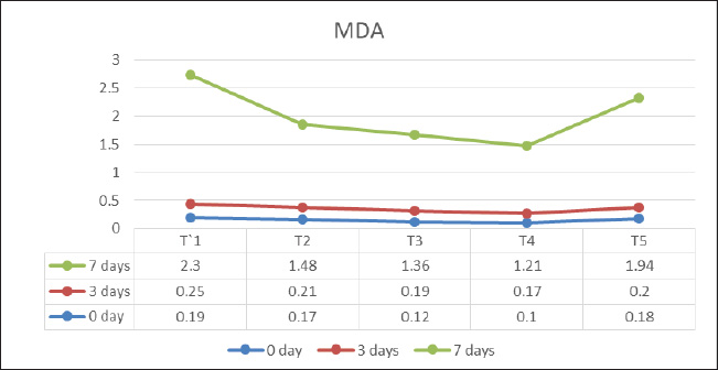 The PH value is expressed as followsThe pH of the minced meat was measured according to the method described by Verma et al. (2008) by homogenizing a 10 g minced meat sample with 100 ml of distilled water via a German Gerhardt homogenizer. The sample solutions were subsequently centrifuged for 15 minutes at 2,000 gx. The mixture was filtered through filter paper No. 1, 1 and the pH was measured using a pH meter (Sadakuzzaman et al., 2021). Determination of thiobarbituric acidApproximately 1 g of the meat sample was homogenized with 25 ml of a cold solution containing 20% trichloro acetic acid (TCA) dissolved in phosphoric acid with a concentration of 2 M in a homogenizer for 2 minutes. The mixture was transferred to a 50-ml volumetric flask, and the volume was filled to the mark with distilled water. The mixture was mixed, and 25 ml was collected and centrifuged at a speed of 3,000 rpm for 30 minutes and filtered through filter paper No. (1). Then, transferred 5 ml of the filtrate to a test tube and 5 ml of thiobarbituric acid reagent solution to it [dissolve a 1 g powder of TBA reagent with 75 ml of double distilled water (90°C–100°C) and mix thoroughly]. Then, 30 ml of N 0.6 of glacial acetic acid was added mixed fully with 50 ml of 25% TCA solution, and cooled to room temperature. Prepared 0.005 M. Blanc’s solution was prepared by mixing 5 ml of distilled water with 5 ml of the reagent solution. The contents of the test tubes were mixed well, closed tightly, and kept in a dark place for 15–16 hours at room temperature. The contents were heated in a water bath for 30 minutes (Tarladgis et al., 1964). The absorbance (A) of the resulting color was measured at a wavelength of 530 nm using a spectrophotometer. The thiobarbituric acid value was calculated by multiplying the absorbance value by the factor 5.2, and the value was expressed on the basis of mg malondialdehyde/kg meat according to the following equation: thiobarbituric acid value (mg MDA/kg meat)=5.2 × A530. Microbiological countsA total of 10 g of lamb meat sample was homogenized with 90 ml of peptone buffer solution for microbial assessment of the total bacteria count and coliform count. The dilutions were prepared from the 101–109 dilution and then cultured via the pour plate method using the diluted 10−6 and enumerated after incubation at 32°C for 24 hours. The cultured media consisted of plate count agar and violet red bile agar (Wali and Abed, 2019; Terrones-Fernandez et al., 2023). Static AnalysisAll data were estimated as the mean ± SD of the experimental data. The data were analyzed using SPSS for analysis of variance (p < 0.05) using (ANOVA) on a two-way basis (SPSS, 2008). The number of repetitions for the analyses (n value) was five. Result and DiscussionPhysical characterizedDrip loss value of lamb meatAs shown in Figure 1, there were significant differences (p < 0.05) lower on drip loss value in all groups: 0, 3, and 7 days of storage at 4°C. Notably, the percentage of drip loss in the T4 treatment group (200 ppm) was 1.39% ± 0.50%, 2.22% ± 0.32%, and 2.70% ± 0.38%, respectively, whereas the lower drip loss value was recorded in T5: 1.49% ± 0.16%, 2.30% ± 0.48%, and 2.76% ± 1.33%, respectively, in all treatment groups and storage periods: 0, 3, and 7 days. The highest percentage of drip loss was 1.64% ± 0.30%, 2.76% ± 0.24%, and 2.96% ± 0.27%, respectively, in control treatment T1 (without treatment) for all storage periods. Water-hold capacity of lamb meatThe results (Fig. 2) revealed a significant difference (p < 0.05) increase in water-holding capacity between the fresh lamb meat of the treatment and control group throughout the period and during refrigerator storage. In the sample treated with T4 (200 ppm) and T3 (150 ppm) CA, the increase in water-holding capacity recorded was 30.69% ± 2.75%, 36.24% ± 5.16%, and 42.08% ± 5.83%, respectively, in treatment T4 and 29.68% ± 2.89%, 35.44% ± 4.83%, and 38.88% ± 7.22%, respectively, in treatment T3. The lowest values for the ability of meat to retain water were 27.59% ± 2.34%, 24.34% ± 1.85%, and 19.68% ± 1.43%, respectively, in the control treatment (T1) in all treatments and all storage periods (0, 3, and 7 days). PH value of lamb meatThe present study (Fig. 3) revealed a significant (p < 0.05) difference in the pH value of fresh lamb meat between different concentrations and storage periods in all treated meat samples that were stored at 4°C. The results reveal a significantly different increase (p < 0.05) in the pH value for lamb meat samples treated with (200 and 150 ppm) of CA and BHA, respectively, and control samples during the storage period at 4°C. The control group recorded lower pH values of 5.75 ± 0.037, 5.82 ± 0.031, and 5.95 ± 0.033, while the groups treated (200 ppm) with CA recorded high pH values of 0.020 ± 5.80, 5.96 ± 0.032, and 5.99% ± 0.036%, respectively, during the storage period. In addition, the sample treated with T5 (150 ppm) the pH values were 5.72 ± 5.72 ± 0.022, 0.067, and 5.92 ± 0.038, respectively. Chemical characterizedThiobarbituric acid value of lamb meatThe present study (Fig. 4) revealed a significant (p < 0.05) difference between the treatments and the different storage periods in terms of the thiobarbituric acid value of fresh lamb meat. Treatment T4 (200 ppm) resulted in lower values of thiobarbituric acid during the entire storage period with values of 0.10 ± 0.10 ± 0.008, 0.007, and 1.21% ± 0.09%, respectively, than the 0.12 0.12 ± 0.01, ± 0.008, and 1.36Z ± 0.06% for T3 (150 ppm) CA, respectively. Compared with those of the control groups, T1 (without added) had high values of 0.19 ± 0.01, 0.25 ± 0.02, and 2.3 ± 0.23, respectively, during the entire storage period. There was a significant difference between all the different treatments during the storage period.