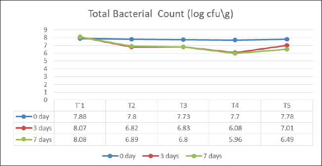 Fig. 3. PH value of fresh lamb meat treated with different concentration of BHA and CA during refrigerator storage. Microbial characterizedTotal bacterial count of lamb meatThe present study (Fig. 5) shows a significant (p < 0.05) difference reduction in the total bacterial count of the treated samples compared with the control during storage. The treated sample with T4 (200 ppm) reduced the total bacterial count during the entire storage period to 7.70 ± 0.02, 6.08 ± 0.49, and 5.96 ± 0.46 (log cfu/g), respectively, whereas the total bacterial count was 7.73 ± 0.04, 6.83 ± 0.02, and 6.80 ± 0.09 (log cfu/g) for T3 (150 ppm) in all storage periods compared with the control group; T1 (without added) increased the total bacterial count during all storage periods to 7.88 ± 0.02, 8.07 ± 0.06, and 8.08 ± 0.42 (log cfu/g), respectively. Significant differences were detected between the groups during the storage period.