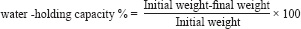 Water-holding capacityFifty grams of each treatment mixture were weighed and homogenized with 50 ml of distilled water for 1 minute, according to methods of Sadakuzzaman et al. (2021), after which the mixture was placed in a centrifuge at a temperature of 4°C and a speed of 5,000 rpm for 10 minutes, after which the percentage of the meat’s ability to retain water was calculated according to the following equation:
