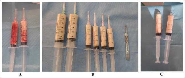 Fig. 1. Ultrasound-guided aspiration of abscess contents in the left kidney of camel number 14. (A). The needle was placed perpendicular to the transducer (B) and then inserted into the center of the abscess (C). Finally, the pus sample was collected (D).