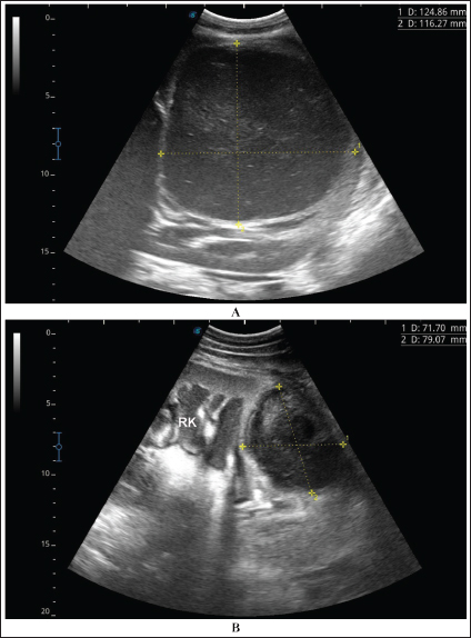 Fig. 4. Ultrasonographic findings of camel number 1 with abscessation of the right kidney. A large abscess was found in image A measuring 12.5 × 11.6 cm with hypoechoic contents and a thick capsule. The abscess in image B compresses the parenchyma of the right kidney (RK) and measuring 7.2 × 7.9 cm with echogenic contents and a thick capsule. A detailed description of the renal abscesses is presented in Figures 4–10. Figure 4 shows sonographic findings in camel number 1 with abscessation of the right and left kidneys. A large abscess measuring 12.5 × 11.6 cm with hypoechoic contents and a thick capsule was detected. A second abscess in the same camel was imaged compressing the parenchyma of the right kidney and measuring 7.2 × 7.9 cm with echogenic contents and a thick capsule. Figure 5 shows ultrasonographic results in camel numbers 2 and 4 with right kidney abscesses. The lesions in camel number 2 appeared markedly large, compressing the renal parenchyma, with echogenic contents and a thickened capsule. The lesion in camel number 4 appeared to compress the renal parenchyma of the right kidney, measuring 6.7 × 8.2 cm with echogenic contents and a thick capsule. In addition, Figure 6. clarifies sonographic findings in camel number 6, where the abscess appeared within the right kidney. The contents were heterogeneous, but the capsule could not be imaged. The urinary bladder in the same animal was imaged with echogenic deposits that appeared highly echogenic compared with the echogenic urine. Ultrasonographic findings in camel number 9 with right kidney abscesses are shown in Figure 7, where the lesion appeared compressing the parenchyma of the right kidney. Its contents are hyperechoic, and its capsule is thick. Figure 8 shows sonographic findings in camel number 11 with abscessation of the right and left kidneys. Abscesses measured 7.6 × 6.9 cm and 9.3 × 8.1 cm with isoechoic contents. A third abscess in the same camel was found within the left kidney. It was relatively large and was isoechoic. Ultrasonographic findings in camels 15 and 16 with abscesses of the left kidney are shown in Figure 9. A large abscess was found in camel number 15 with isoechoic contents and a thick capsule, while a small abscess was imaged in the left kidney of animal number 16 with heterogeneous contents. Figure 10 shows the ultrasonographic findings in camel number 17 with abscessation of the left kidney. A large abscess was found compressing the parenchyma of the left kidney with isoechoic contents. The urinary bladder in the same camel contained echogenic deposits that appeared to be highly echogenic.