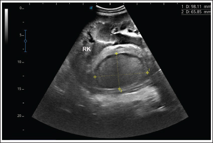 Fig. 7. Ultrasonographic findings in camel number 9 with abscessation of the right kidney-. The lesion appeared to compress the parenchyma of the right kidney (RK), its contents are hyperechoic, and its capsule is thick.