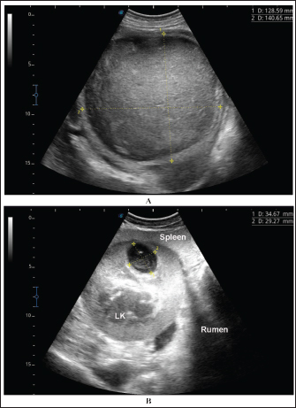 Fig. 10. Ultrasonographic findings in camel number 17 with abscessation of the left kidney. Image A shows a large abscess compressing the parenchyma of the left kidney (LK) with isoechoic contents. Image B shows the urinary bladder (UB) in the same animal with echogenic deposits that appeared highly echogenic compared with the echogenic urine. In dromedary camel medicine, US has been found valuable in scanning normal thoracic and abdominal organs as well as for the diagnosis of various intra-abdominal disorders (Tharwat et al. 2012a,b,c,d,e,f; Tharwat 2013a,b; Tharwat et al. 2013; Tharwat and Al-Sobayil 2016a,b; Tharwat et al. 2017; Tharwat et al. 2018a,b,c; Tharwat 2019; Tharwat 2020a,b,c; Tharwat 2021; Tharwat and Al-Hawas 2021; Tharwat and El-Tookhy, 2021; Tharwat et al., 2023; Sadan et al., 2024; Tharwat; 2024; Tharwat et al. 2024a; Tharwat and Al-Hawas 2024; Tharwat and Tsuka 2024; Tharwat et al. 2025a,b). It was also proved that ultrasound is valuable in dromedary camels for assistance in the antemortem diagnosis of abdominal masses (Sadan et al. 2024; Tharwat et al. 2024b,c,d). In the present study, either one or more abscesses of various sizes and of different echogenicity were visualized within the kidney compressing its parenchyma, and all cases were unilateral except 2 cases that were bilateral. Most lesions in this investigation affected the right kidney, followed by the left kidney. Unilateral lesions were found in the right kidneys only in nine cases (52.9%) and in the left kidneys only in six cases (35.3%). Bilateral affection of both kidneys was found in two cases (11.7%). In approximately 25% of the diseased camels, the urinary bladder contained echogenic urine alongside hyperechoic deposits. The ultrasound-guided aspiration of renal lesions was very useful for collecting samples for bacteriological examination. The procedure was also safe and effective, ass post-aspiration complications were not observed in any of the aspirated camels. Several pathogens are reported to cause renal abscesses in humans and animals. In humans, E. coli, K. pneumonia, and S. aureus have been isolated (Lee et al. 2008., Buschel et al., 2022). In animals, a renal subcapsular abscess caused by S. pseudintermedius was reported in an 11-year-old Drahthaar Dog (Cola et al. 2020). In cattle, pyelonephritis is caused by a variety of pathogens, such as Salmonella dublin, Corynebacterium cystitidis, C. renale, and Mannheimia varigena (Floeck 2007; Braun et al. 2008; Komatsu et al. 2019; Taghipur et al. 2015; Smith et al. 2020). In dromedary camels, S. lugdunensis and E. coli were isolated from 2 animals with renal abscesses (Tharwat et al. 2018a,b). In this study, S. lugdunensis was isolated from 10 out of 17 cases, S. aureus from 5 cases, and unidentified catalase-positive and coagulase-negative Staphylococcus species from 2 cases. The high prevalence of S. lugdunensis is quite unusual. Primarily, it is a human opportunistic pathogen that causes skin and soft tissue infections; especially endocarditis (Frank et al. 2008). In animals, it has been reported to cause infections in companion animals (Rook et al., 2012), pet cats (Bierowiec 2020), cattle (Ardigò et al. 2014), and camels (Tharwat et al. 2018b). Our findings indicate that S. lugdunensis is an increasingly common camel renal abscess pathogen in the study area, which necessitates real estimation and, in turn, the development of specific vaccines to avoid high economic losses and public health impact. ConclusionTo the best of our knowledge, this is the largest study investigating renal abscesses in dromedary camels, as only two case studies have been reported. As demonstrated in this study, laboratory tests are usually nonspecific for confirming renal abscesses; however, US and ultrasound-guided aspiration have been found to be extremely helpful for verifying renal abscesses in the dromedary camels. AcknowledgmentsThe authors would like to thank Professor Sébastien Buczinski, Department of Clinical Sciences, Faculty of Veterinary Medicine, University of Montreal, Canada, for critical reading of the manuscript and for his fruitful suggestions. Conflict of interestThe authors declare no conflict of interest. FundingThis research received no specific grant. Author contributionMT: conceptualization, data collection, writing of the original manuscript draft, and preparation of figures and tables. HE: sharing of practical work and editing. HS: microbiological work and editing. AA: review and editing. All authors have approved the final manuscript for publication. Data availabilityAll data supporting the findings of this study are available in the manuscript, and no additional data sources are required. ReferencesArdigò, P., D’Incau, M. and Pongolini, S. 2014. Abortion in cattle due to infection with Staphylococcus lugdunensis. J. Vet. Diagn. Investig. 26, 818–820. Bierowiec, K. 2020. Crosssectional study of Staphyloccus lugdunensis prevalence in cats. Sci. Rep. 10, 15417. Braun, U., Nuss, K., Wehbrink, D., Rauch, S. and Pospischil, A. 2008. Clinical and ultrasonographic findings, diagnosis and treatment of pyelonephritis in 17 cows. Vet. J. 175, 240–248. Buschel, H., Leung, P., Stalewski, H., Carroll, D. and Mariyappa-Rathnamma, B. 2022. Renal abscesses in children: an 11-year retrospective study and review of the literature. ANZ. J. Surg. 92, 3293–3297. Cola, V., Foglia, A., Pisoni, L., Dondi, F., Avallone, G., Gruarin, M., Zanardi, S., Rinnovati, R. and Del Magno, S. 2020. Kidney-sparing surgery for renal subcapsular abscess caused by Staphylococcus pseudintermedius in a Dog. J. Am. Anim. Hosp. Assoc. 56, 242–247. Floeck, M. 2007. Sonographic application in the diagnosis of pyelonephritis in cattle. Vet. Vet. Radiol. Ultrasound. 48, 74–77. Frank, K.L., Del Pozo, J.L. and Patel, R. 2008. From clinical microbiology to infection pathogenesis: how daring to be different works for Staphylococcus lugdunensis. 2008 Clin. Microbiol. Rev. 21,