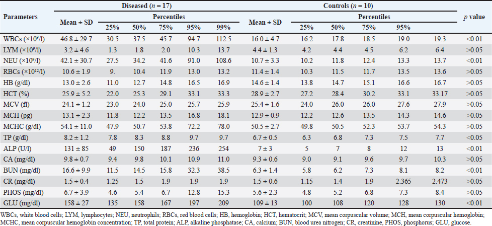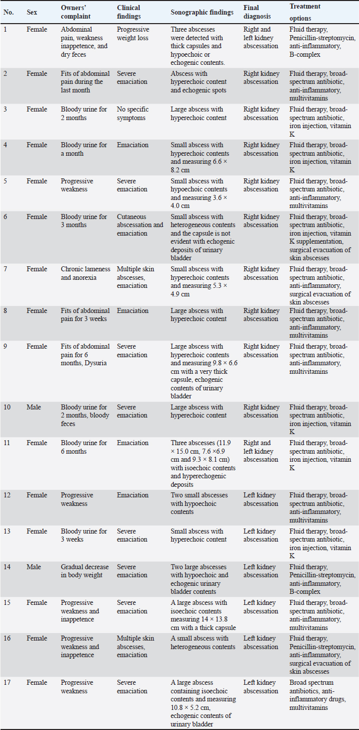 AbstractBackground: Although renal abscessation is rarely reported in dromedary camels, it is increasingly detected in this species. Aim: This study aimed to investigate renal abscessation in camels with special emphasis on ultrasonographic findings and causative agents. Methods: Seventeen diseased camels (Camelus dromedarius) were examined. In addition, 10 healthy camels were used as the control group. A jugular puncture was performed to collect blood in EDTA tubes and serum samples. The thorax and abdomen were examined via transcutaneous and transrectal ultrasound. A free-hand ultrasound-guided aspiration technique using a 14G × 170 mm spinal biopsy needle was used for aspiration of the renal lesion content. Results: The signs of diseased camels included general gradual and/or progressive weakness, inappetence or anorexia, passage of dry feces, dysuria, bloody feces, lameness, bloody urine, and abdominal pain. Neutrophilic leukocytosis is the most significant hematological abnormality. Significant biochemical alterations included hyperproteinemia, azotemia, hyperglycemia, and increased serum alkaline phosphatase activity. Single or multiple renal abscesses were visualized sonographically compressing the renal parenchyma. Three abscesses measuring 5.2–15.0 cm were scanned in 2 camels; one affected the left and the other affected the right kidneys. In addition, two abscesses were imaged in 2 camels; both are affecting the left kidney. However, single abscesses measuring 3.6–14.0 cm in length were recorded in the remaining 13 camels; nine in the right and four in the left kidneys. The contents of the abscesses were hyperechogenic in 8 cases, hypoechoic in 4, isoechoic with hyperechoic foci in 3 cases, and heterogenous in 2. In 4 of the 17 diseased camels, hyperechoic urine and echogenic deposits were found within the urinary bladder. Bacteriological examination showed pure growth of Staphylococcus lugdunensis in 10 coagulase-negative isolates, Staphylococcus aureus in 5 coagulase-positive isolates, and 2 unidentified Staphylococcus species. Conclusion: Sonography is extremely helpful for verifying renal abscesses and is a good guide for abscess aspiration in dromedary camels. The isolation of S. lugdunensis from camel renal abscessation in this study was significant because of the zoonotic nature of this organism. Keywords: Camels, Kidney diseases, Renal abscessation, Staphylococcus, Ultrasound. IntroductionIn human medicine, renal abscessation is a rare condition, and if discovered, presentation is always non-specific, which delays the detection of the lesion; thus, severe complications, such as loss of the kidney and terminal death, may occur (Jiménez et al. 2022). Predisposing causes of infection of the urinary tract include diabetes mellitus and the presence of an underlying condition (Lim and Ng 2011; Tang and Cheong 2017). Bilateral renal abscesses were diagnosed by ultrasonography (US) and computed tomography (CT) in a 16-year-old girl; differential diagnosis included polycystic kidneys with infected cysts (Tang and Cheong 2017). The use of clinical symptoms and diagnostic imaging techniques, such as CT, magnetic resonance imaging, and the US, results in early detection and consequently improves prognosis (Rubilotta et al., 2014). In a report describing 56 consecutive cases of perirenal and renal abscesses, the causative organism in 44% of the cases was Escherichia coli (E. coli) and Klebsiella pneumoniae in 28% of the patients (Lee et al. 2008). In another 11-year retrospective investigation, Staphylococcus aureus was the causative organism in 50% of the cases, whereas E. coli was the etiological pathogen in 29% of the patients (Buschel et al. 2022). In veterinary medicine, the diagnosis of renal abscesses was reported to be linked to diabetes mellitus in a 9-year-old female Dalmatian. The dog in the latter case was diagnosed with abdominal US and aspiration of the abscess under ultrasound guidance and was treated by nephrectomy (Hess and Ilan 2003). Nephrectomy was also performed unilaterally in foal with a renal abscess (Trotter et al. 1984). Ultrasonography (US) and ultrasound-guided aspiration of the abscess were also performed for the diagnosis of renal abscesses in Boerboel dogs (Kitshoff et al. 2011). Bilateral renal abscessation caused by E. coli was previously reported in a male dromedary camel (Tharwat et al. 2018a). In another 6-year-old female dromedary camel reported with chronic suppurative pyelonephritis caused by Staphylococcus lugdunensis, unilateral surgical nephrectomy was performed (Tharwat et al. 2018b). In the latter 2 case reports, the results have stressed the usefulness of sonography for the detection and verification of renal abscesses and have also shown the effectiveness of ultrasound guidance for obtaining samples of kidney lesions. Ultrasound has also proven useful for the early detection and verification of different diseases affecting the dromedaries, as well as the scanning of healthy camels (Tharwat, 2024). This study was conducted to prospectively investigate the clinical presentation, sonographic and hematobiochemical findings, causative organisms, diagnosis, and treatment of 17 dromedary camels with right and left kidney abscesses. Materials and MethodsAnimals and clinical examinationsWe examined 17 camels (Camelus dromedarius) (15 females and 2 males) aged 7–15 years were examined at the Veterinary Hospital, Qassim University between 2019 and 2024. The camels presented with different complaints, including inappetence or anorexia, gradual or progressive decrease in body weight, fits of abdominal pain, weakness, dry feces, chronic lameness, and voiding of bloody urine. The duration of the disease ranged from 3 weeks to 6 months. Previous medications included antibiotics, anti-inflammatories, appetite stimulants, multi-minerals, and vitamins. Each camel was clinically examined upon admission. Examination includes measurement of respirator
