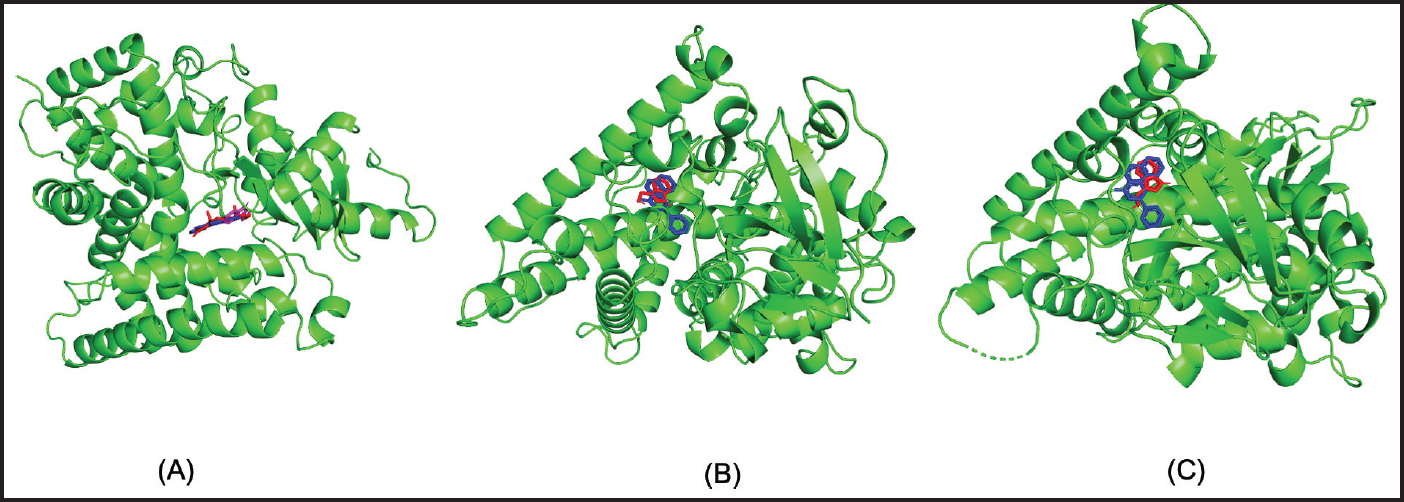 Fig. 1. The results of molecular docking simulation between the CYP19 protein (green) and the compounds Indole-3-Carbinol (Magenta), Alpha-Naphthoflavone (Blue), and Testosterone (Red). CYP19 (A), CYP1A1 (B), CYP1B1 (C).