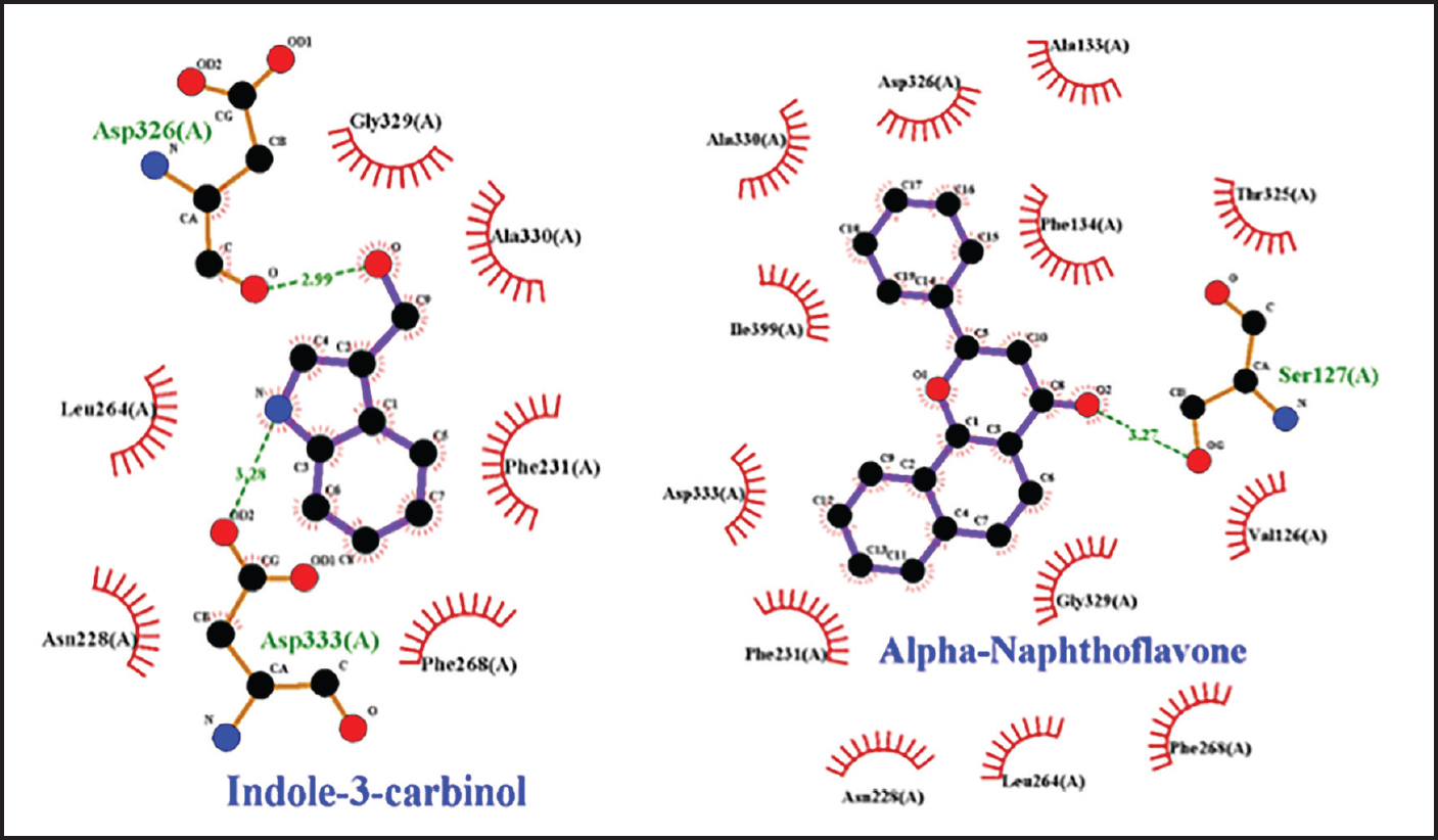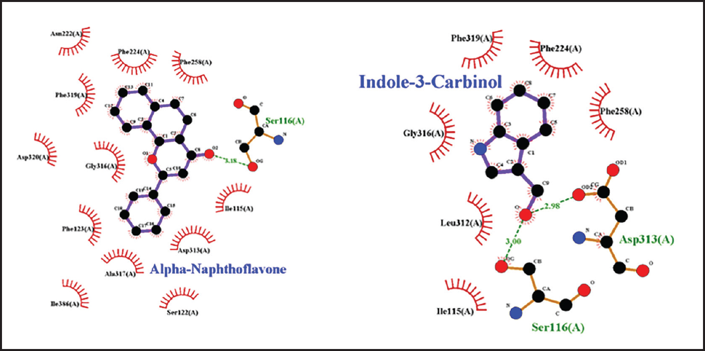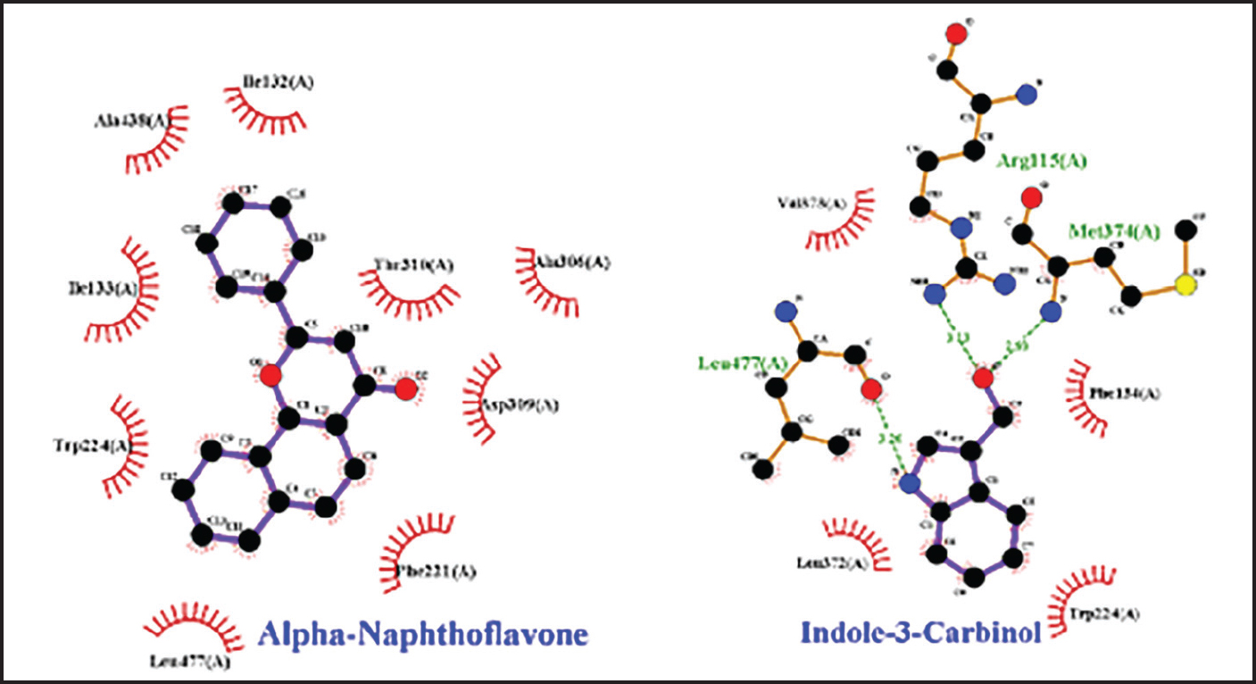 Fig. 3. Amino acid residues in the CYP1A1 protein complex with Indole-3-carbinol and alpha-napthoflavone. Table 4. Amino acid interactions in the CYP19, CYP1A1, and CYP1B1 complex.