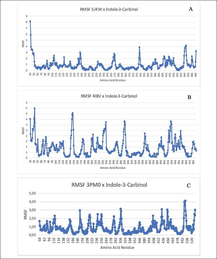 Fig. 5. Root Mean Square Fluctuation (RMSF) results for molecular dynamics simulations of the compound of interest with the CYP19, CYP1A1, and CYP1B1 protein.