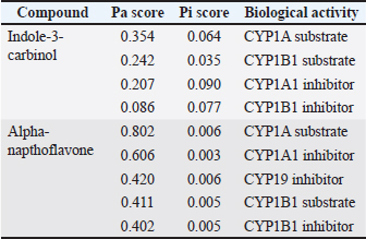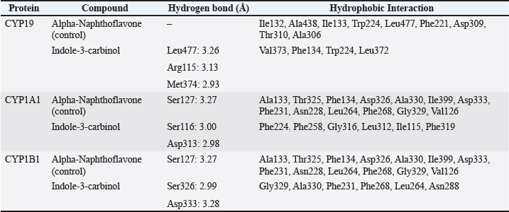 Fig. 2. Amino acid residues in the CYP19 protein complex with Indole-3-carbinol and alpha-napthoflavone. Analysis of compound drug-likenessBased on Lipinski’s Rule of Five, I3C and alpha-naphthoflavone do not violate any of the Lipinski Rule of Five parameters (Table 2). These results indicate that both compounds are easily absorbed and are potential candidates for oral therapy. Molecular dockingThe results of molecular docking were intended to assess the stability of the interaction between the ligand and the target protein. A lower binding affinity indicates a higher level of interaction stability, suggesting that the ligand has a stronger inhibitory effect on the target protein (Table 3). The docking results indicate that I3C, found in broccoli, binds to its target protein at the same site as the control (Fig. 1). I3C binds to the target protein (CYP19) at the same binding site with a similar pose as the control. I3C shares the same residues with the alpha-naphthoflavone, including Ile133, Trp224, Leu372, Phe134, Val373, Ala306, Met374, and Arg115 (Fig. 2). CYP1A1 interacted with the I3C and alpha-naphthoflavone at the grid position. This result suggested that CYP1A1 interacts with I3C at the same site as alpha-naphthoflavone (Fig. 3), possibly with a different pose from that of alpha-naphthoflavone (Table 4). This result can be inferred from the differences in amino acid residue interactions, as shown in Figure 3. Similarly, CYP1B1 interacted with I3C and alpha-naphthoflavone at the grid position. This result indicated that CYP1B1 interacts with I3C at the binding site of alpha-naphthoflavone. The hydrogen bonds and hydrophobic interactions with residues such as Ala330, Phe231, Leu264, Phe268, and Gly329 are shown in Figure 4. Molecular dynamics simulationsA molecular dynamics simulation was conducted to analyze the stability of the protein and its interaction with the ligan. The simulation results showed that the RMSF (Root Mean Square Fluctuation) value is above 3ã…. This indicates that most amino acids move during the simulation. Although the interactions between I3C and CYP19 (Fig. 5A) and between I3C and CYP1B1 (Fig. 5C) are comparable to those between I3C and CYP1A1 (Fig. 5B); overall, the interactions between I3C and CYP19, CYP1A1, and CYP1B1 are less stable. In vivo studyIn vivo studies revealed that I3C treatment affected CYP19 concentrations in male rats, although the inhibitory effect was less pronounced. As shown in Figure 6, treatment with letrozole (a synthetic aromatase blocker) and Broccoli powder did not significantly differ (p > 0.05). DiscussionIn this study, we found that all tested criteria indicate that I3C, found in broccoli, has the potential to be used as an aromatase blocker, although its effectiveness does not yet match that of the control. This was demonstrated by the drug safety criteria, docking results showing negative binding, and RMSF values indicating instability. The use of plants as medicine, known as phytotherapy, is based on the therapeutic benefits of secondary metabolites, which have health-related effects regardless of whether their use has been clinically proven. Broccoli inherently contains numerous bioactive compounds, such as flavonoids, polyphenols, and coumarins, found in the florets, leaves, and stems. Among these parts, the leaves and stems, which are considered byproducts, contain many unique active metabolites that may have potential biological functions for further research and utilization (Zhao et al., 2024).