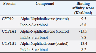 Our findings show that the binding of I3C to CYP19 has promising potential, although it has yet to surpass the control. However, this does not mean that broccoli cannot be used as an aromatase blocker. This is because broccoli is a species with polymorphism, which may alter the affinity of CYP19 for testosterone versus 16-hydroxyandrostenedione (Tworoger et al., 2004). Data indicate that 16-hydroxyandrostenedione has a separate binding site from testosterone and androstenedione, but each hormone inhibits the aromatization of the other (Auvray et al., 2002). The T: E ratio is critical, as circulating estrogens can compete with androgens for binding to sex hormone-binding globulin, and it is generally assumed that the synthesis of sex hormone-binding globulin is regulated and reflects the androgen–estrogen balance (Modugno et al., 2001). Therefore, we suggest that this be further investigated.