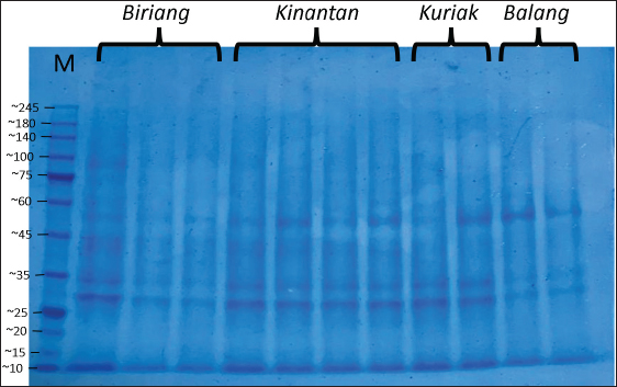Fig. 1. SDS-PAGE profile of spermatozoa proteins in Kokok Balenggek roosters. Ethical approvalThe Faculty of Medicine, Universitas Andalas, Indonesia’s ethical clearance committee helped secure consent for the use of animals in research (Ethics no: 268/UN.16.2/KEP-FK/2024). ResultThe macroscopic characteristics of the semen of the four Kokok Balenggek (AKB) rooster phenotypes are presented in Table 1. The semen volume varied significantly across phenotypes (p < 0.05), with the highest volume observed in the Biriang phenotype (1.18 ± 0.72 ml), followed by Kinantan (0.99 ± 0.39 ml), Kuriak (0.40 ± 0.17 ml), and the lowest in Balang (0.22 ± 0.07 ml). All phenotypes had white-colored semen with a specific smell and a thick consistency, except for the Kuriak phenotype, which had a more fluid consistency. Microscopic examination of sperm characteristics is shown in Table 2. The highest sperm concentration was found in the Kinantan phenotype (1.66 ± 0.15 × 109/ml), followed by Biriang (1.61 ± 0.30 × 109/ml) and Balang (1.41 ± 0.11 × 109/ml), with the Kuriak phenotype having the lowest concentration (0.62 ± 0.14 × 109/ml) (p < 0.05). Sperm motility was highest in the Biriang, Balang, and Kinantan phenotypes (83%, 81%, and 82%, respectively), whereas the Kuriak phenotype exhibited significantly lower motility (64%) (p < 0.05). Viability percentages were similar across all phenotypes, with no significant differences (ranging from 91% to 93.66%) (p > 0.05). The percentages of abnormalities were lowest in the Biriang and Balang phenotypes (6.20% and 6.1%, respectively), whereas the Kinantan and Kuriak phenotypes had slightly higher abnormalities (8.46% and 7.20%, respectively) (p > 0.05). Plasma membrane integrity was highest in the Kinantan and Biriang phenotypes (79.60% and 79.20%, respectively), whereas the Kuriak phenotype had the lowest membrane integrity (67.40%) (p < 0.05). The protein concentration was highest in the Kinantan phenotype (2.23 ± 0.76 mg/ml), followed by Biriang (1.90 ± 0.54 mg/ml), Kuriak (1.69 ± 0.99 mg/ml), and Balang (0.81 ± 0.13 mg/ml) (p < 0.05). Protein profiles in both spermatozoa and seminal plasma from four Kokok Balenggek (AKB) rooster phenotypes were analyzed according to MW. As shown in Figure 1, sperm proteins with MWs of 10, 25–35, 35–45, 45–65, and 100 kDa were identified in all phenotypes (Kinantan, Biriang, Jalak, and Balang). These proteins were consistently present across the different phenotypes, indicating a common protein profile in AKB sperm. In seminal plasma, as presented in Figure 2, proteins with MWs of 10, 20–25, 25–35, 45, 65, 75, 140, and 180–245 kDa were detected in all phenotypes. Similar to sperm proteins, these seminal plasma proteins were found consistently across the Kinantan, Biriang, Jalak, and Balang phenotypes, further suggesting a shared protein profile among the different phenotypes. DiscussionThe semen characteristics of Kokok Balenggek chickens observed in this study were slightly different from those of previous research (Ananda et al., 2023, 2024; Jaswandi et al., 2023; Husmaini et al., 2024). Specifically, the sperm concentration was higher in our study, and the percentage of abnormalities was also higher. In contrast, the percentages of motility and viability were relatively similar. These differences can be attributed to variations in the methodology used or to potential differences in environmental conditions. Compared with Thai chickens, our results indicated a lower sperm concentration and slightly lower viability (Lewchalermvong et al., 2022). Despite these differences, sperm quality in the four Kokok Balenggek phenotypes studied remained within the reference range for chickens. Similar findings were reported by Shanmugam et al. (2012), whose research showed that the volume of adult chickens ranged from 0.36 ± 0.05 to 0.48 ± 0.06 ml, with a viability range of 91.21% ± 1.49% to 92.12% ± 1.90%, abnormality percentages from 5.58% ± 2.82% to 6.13% ± 2.76%, and intact plasma membrane percentages ranging from 87.54% ± 1.75% to 89.65% ± 1.60%.