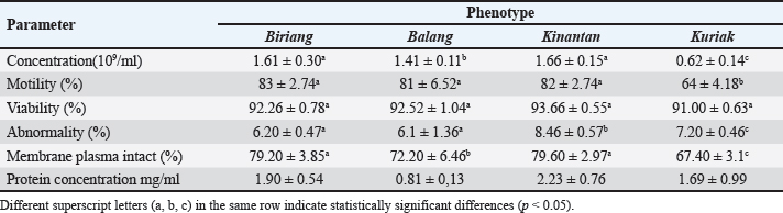 ΔA1: OD sample–OD blank ΔA2: OD standard–OD blank c: Standard concentration (0.563 mg/ml) f: Sample dilution factor Protein profiling by SDS-PAGEProtein profiles of the spermatozoa and seminal plasma from each phenotype were analyzed using Sodium Dodecyl Sulfate–Polyacrylamide Gel Electrophoresis (SDS-PAGE). A total of 20 µg of protein from each sample was mixed with NuPAGE™ LDS Sample Buffer, boiled for 10 minutes at 75°C, and loaded onto a 10% acrylamide gel (Q-PAGE™ TGN Precast Gel, QP4210). Electrophoresis was performed at 110 V for approximately 90 minutes, followed by staining with Fast Coomassie Blue Staining Solution (Elabscience®) overnight. The remaining stain was removed by soaking the gel in ddH2O in a closed container and washing it 3 times. Protein bands on the gel were observed using Gel Doc (iBright 1500, Invitrogen, Thermo Fisher Sci). The read sample protein bands were compared with the marker band (Excell band 3-color Broad Range Protein Marker 3.5-245 kDA, SMOBIO® Technology, Inc. Taiwan) to determine the protein MW. Data analysisSperm characteristics are presented as averages and standard deviations. The normality of the data was checked using the Shapiro–Wilk test in IBM SPSS. The data were statistically analyzed using a randomized block design, followed by the Duncan multiple range test in IBM SPSS to determine differences between phenotypes. For percentage data, arcsine transformation was applied before analysis using the appropriate statistical tests in IBM SPSS. Protein data were presented descriptively. Table 1. Microscopic characteristics of Kokok Balenggek roosters semen across different phenotypes.