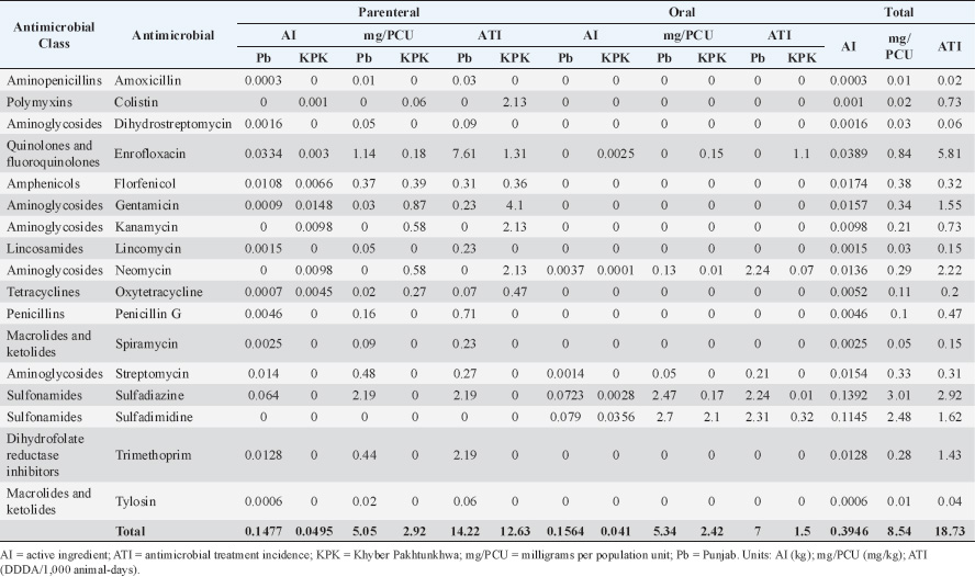Calculations of WHO critically important antimicrobialsAll antimicrobial drugs used in adult dairy cattle and calves were categorized per the WHO list of critically important antimicrobials (IAs) for human medicine (WHO-CIA) (WHO, 2019). AMU percentages of WHO-CIA classes were calculated for the total ACCs used in adult dairy cattle and calves. Ethical approvalNot needed for this study. ResultsAMU data collectionDue to voluntary participation, for the summer phase, 10 out of 12 commercial dairy cattle farms completed the DCT treatment record. However, for the winter phase, PD-4 and PD-6 from Punjab and KD-3 and KD-4 from KP did not continue the survey and were replaced with PD-7 and PD-8 and KD-5 and KD-6, respectively. AMU of adult dairy cattleIn dairy cattle, 29 ACCs belonging to 15 antimicrobial classes were used at the surveyed farms in Punjab and KP during summer and winter. The cumulative AMU in adult cattle across both provinces for summer and winter was 15.23 kg, 6.36 mg/PCU, and 26.34 DDDA/1,000 animal-days. The total ACC weight of adult cattle in each province, during the time periods of study, was 12.61 kg in Punjab and 2.62 kg in KP. The total mg/PCU AMU for adult cattle in Punjab and KP in the studied time period was calculated to be 7.14 and 4.15, respectively. Streptomycin (3.17 mg/PCU), oxytetracycline (1.51 mg/PCU), enrofloxacin (1.38 mg/PCU), penicillin G (1.32 mg/PCU), and amoxicillin (1.09 mg/PCU) were the most heavily used antimicrobials per adult cow PCU in Punjab and KP in both seasons Table 2. The incidences of antimicrobial treatment for adult cattle in Punjab and KP across both seasons and all antimicrobials were 34.14 and 10.43 DDDA/1,000 animal-days, respectively. With all study treatments of adult cattle totalled, enrofloxacin (5.92 DDA/1,000 animal-days), penicillin G (2.81 DDA/1,000 animal-days), gentamicin (2.73 DDA/1,000 animal-days), oxytetracycline (1.56 DDA/1,000 animal-days), and tylosin (1.48 DDA/1,000 animal-days) were overall the most frequently used antimicrobials. Enrofloxacin, penicillin G, and gentamicin were shared antimicrobials among the most frequently used for adult cattle in Punjab and KP, with treatment incidences 7.09, 3.54, 3.5 DDDA/1,000 animal-days and 3.53, 1.32, and 1.17 DDDA/1,000 animal-days in Punjab and KP, respectively (Table 2, Fig. 2).