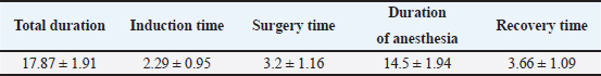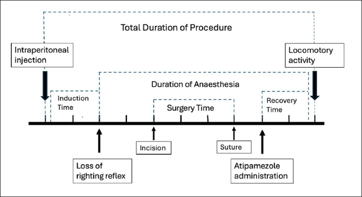 Fig. 2. Consolidated standards of reporting trials flow diagram of the rats included in the experimental study. Physiological parametersHR decreased significantly at T0 (p < 0.05) compared with baseline (Tpre). After 5 minutes from atipamezole administration (T5), the heart rate increased significantly compared with T0, reaching values comparable to Tpre and remaining stable at subsequent times T10, T15, and T20. Similarly, RR was lower at T0 than at Tpre; however, no statistical differences were observed between the various study times (p > 0.05). Body temperature decreased significantly at all study times compared with Tpre (p < 0.05). Subsequently, at T15 and T20, it increased significantly compared with T5, but without reaching baseline values. Regarding SpO2 values, the mean was 99% ± 0.32 % and 98% ± 0.45 % at Tsurg and T0, respectively. All of the above parameters are reported as mean ± standard deviation in Table 3. No subject received rescue analgesia, and the Rat Grimace Scale showed score=0 at TGrim0, TGrim1, and TGrim2. DiscussionIn this study, the application of the anesthesiologic protocol consisting of xylazine/ketamine/buprenorphine in short-term surgical procedures in experimental rats was described. From the data obtained, we can state that the above-mentioned protocol guarantees the following: 1) rapid sedation after intraperitoneal inoculation; 2) suitable anesthetic depth during short-term procedures that involve mild/moderate nociceptive stimulation; 3) rapid awakening, thanks to the antagonization of the α2-agonist by administration of atipamezole. Regarding the induction phase, all subjects achieved a sedation score ≥ to 3 within 3 minutes of drug administration. The X/K association has been described in several studies; however, there are conflicting opinions regarding its efficacy (Stokes et al., 2009). Albrecht et al. (2024AB) highlighted an induction time of about 4 minutes; however, tolerance to surgery was evidenced only after 10 minutes from drug administration (Albrecht et al., 2014A). It is the opinion of the authors that the addition of buprenorphine in our protocol has induced a synergism of potentiation with the other drugs favoring a deeper anesthetic level in faster times and good analgesia during nociceptive stimulations (Curtin et al., 2009). The absence of an analgesic in an anesthetic protocol could, therefore, lead to a greater response to the induced painful stimulations (Hedenqvist et al., 2000; Oh and Narver 2024). It should be noted, however, that the nature of buprenorphine (partial µ agonist) makes it an excellent analgesic for the management of mild/moderate pain but may not be sufficient for the management of severe nociceptive stimuli, in which the administration of pure µ agonists is more recommended (e.g., fentanyl and methadone) (Arenillas et Gomez de Segura, 2018; Alemán-Laporte et al., 2020). Table 2. Mean ± SD of different times (minutes) registered during the experimental procedure.