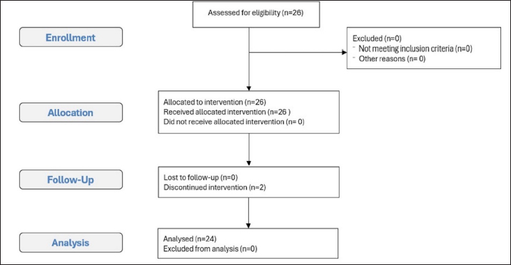 Statistical analysisStatistical analysis was performed using MedCalc software 9.0 (MedCalc version 9.2.10). All data resulted normally distributed based on the Shapiro–Wilk test. Physiological parameters were evaluated using the one-way ANOVA test to perform a comparison between times. All results are reported as mean ± standard deviation. Differences with a p value < 0.05 were considered statistically significant. Power calculations and the primary study aimThe aim of the primary study was to evaluate the inflammatory response, immunological properties, and integrative capacity of decellularized membranes obtained through tissue engineering from human donor tissue. The sample size calculation was performed using Prudente et al. 2016. To obtain the correct sample unit, G*Power Version 3.0.10 software was used at the University of Düsseldorf, Germany (Faul et al., 2009). The analysis was performed using two different parameters to obtain greater reliability in the sample selection process. From the evaluation of interleukin 1, the sample power calculation indicated a “power” of 0.95, an “effect size” of 1.85, and an alpha error of 0.05. The extrapolated results from the analysis suggest that a minimum number of 8 rats per study group is sufficient to obtain statistical significance. From the evaluation of tumor necrosis factor alpha, the calculation of the sampling power indicated a “power” of 0.95, an “effect size” of 1.36, and an alpha error of 0.05. The extrapolated results from the analysis suggest that a minimum of 13 rats per study group are sufficient to obtain sampling significance. The two parameters were compared 4 and 30 days after tissue implantation, as described in the literature. The one-tailed t-test was used. An a priori analysis was used to evaluate the differences between the two independent means. It was, therefore, decided to use 2 groups of 13 animals (a total of 26) because the number of the two groups would have enough power to guarantee a sample significance for the different inflammatory factors to be analyzed. Ethical approvalThis study was approved by the Italian Ministry of Health (protocol number 424/2021-PR) in accordance with the recommendations of the Guide for the Care and Use of Laboratory Animals of the National Institutes of Health. ResultsThe mean weight of the animals on the day of surgery was 349.69 ± 93.46 g. Two rats were excluded due to incorrect intraperitoneal administration of the anesthetic drugs. The remaining 24 subjects survived the surgical procedures and completed the study. This study conforms to the Consolidated Standards of Reporting Trials (CONSORT) Statement 2010 for reporting randomized trials (Moher et al., 2010) (Fig. 2). Reflexes and times recordedThe mean total procedure duration was 17.87 ± 1.91 minutes, while the surgery time was 3.2 ± 1.16 minutes. The mean time from intraperitoneal injection to loss of righting reflex (Induction Time) was 2.29 ± 0.95 minutes. At the time of surgery, all subjects showed a deep anesthetic plane (score ≥ 3), and no response to skin incision was observed (score=0). The mean time from loss of righting reflex to return of locomotor activity (Duration of Anesthesia) was 14.5 ± 1.94 minutes. The period from atipamezole injection to return of locomotor activity (Recovery Time) was 3.66 ± 1.09 minutes. At T0, all rats showed an absence of spontaneous activity and loss of righting reflex (Recovery Score ≥ 2), whereas at T5, they returned to spontaneous activity (Recovery Score < 2) (Table 2).