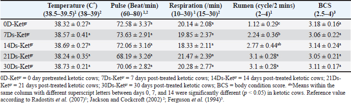Table 2. Mean values of the appetite score, RFS, MDS, and MCS in pretreated and post-treated ketotic cattle (n=50).