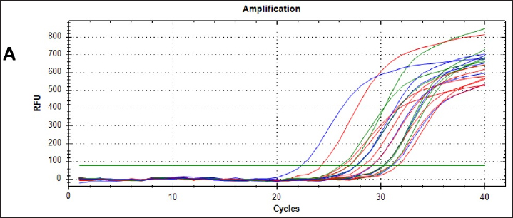 Fig. 1. Real-time qPCR amplification plot of canine parainfluenza virus-5 in nasal swab samples from sick dogs, the reaction started at 22, 24, 26, 28, and 31, respectively. All RT-qPCR-positive samples were confirmed by RT-nPCR. The positive samples were categorized as CPIV-5 type based on NP gene analysis (Fig. 2). Ten final RT-nPCR products were sequenced, and BLAST outcomes were documented in the NCBI Gene Bank (National Centre for Biotechnology Information). The nucleotide sequences generated in our study were deposited in GenBank. These isolates are indicated as: OR405277.1, OR405278.1, OR405279.1, OR405280.1, OR405281.1, OR405282.1, OR405283.1, OR405284.1, OR405285.1, and OR405286.1. The phylogenetic tree shows the genetic relation of CPIV-5 isolates obtained from Iraq, South Korea, China, Brazil, and the UK. These isolates are indicated as OR405286, OR405278, OR405277, OR405280, OR405282 among others, and belong to the Iraqi CPIV- 5 strain; hence, their similarity is apparent from the cluster formation. This clustering gives an indication of the relatedness of the Iraqi isolates, indicating either local transmission or little genetic variation occurring within this region of the world. The isolates from South Korea, China, and Brazil are in different clades indicating geographical and genetic differences from the Iraqi strains. Notably, the South Korean and Chinese canine isolates clustering with each other are more closely related to each other than to those of the Iraq isolates, suggesting different evolutionary lineages according to geographical location (Fig. 3). The changes were found in amino acid 58, 59, 60,61 C→W, M→H, T→ D and A→ S (Fig. 4). Bootstrap values have been shown on the tree and there are some branches that are supported by 100% which add more statistical support to the indicated grouping and the observed genetic clustering. Different values such as 0.0046 and 0.0106 shown beside the branch indicate genetic distance; short branches between isolates are optimistic for bare minimum variation among isolates, and it is in the case of Iraqi isolates.
