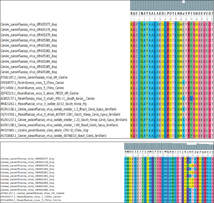 Fig. 4. Multiple sequence alignment of the identified sequences translated into their relevant amino acids. These were compared with other global sequences to show the differences and similarities. Branch length: The branch length, represented by values such as 0.0046 and 0.0106, indicates the level of genetic divergence between isolates, lesser branches among the Iraqi isolates signify little genetic Further, there is a separate group of sequences from South Korea and Brazil (KU341107.1, KU341106.1) which appears to be genetically divergent from both the Iraqi and rest of the isolates due to the evolutionary divergence or variation in viral dynamics in these countries. DiscussionThe CPIV-5 is an extremely contagious pathogen and produces mild to moderate respiratory infections in dogs widespread, coinfection with other viruses and pathogens can cause severe clinical signs (Cheng et al., 2023; Zhou, et al., 2024). Clinical diagnosis is based on case history, clinical signs, and response to therapy, the results of clinical examination of the dogs in the current study correlated with other results, and they showed clinical signs including paroxysmal harsh cough for 2–6 days, serous nasal discharge, conjunctivitis, retching, tonsillitis, pharyngitis, with or without pyrexia, lacrimation, depression, and dyspnea (Reagan and Sykes, 2020; Cordisco et al., 2022). This pathogen invades the epithelial cells of the respiratory system and affects the cilia and alveolar macrophage predisposing to lower respiratory tract disease (bronchitis, pneumonia) that is usually associated with secondary bacterial infections, such as Bordetella bronchiseptica infections (Sykes, 2022). The present study confirmed that this virus is present in symptomatic and apparently healthy dogs. The highest positivity rate appeared in sick animal samples. Similar to our results, numerous studies recorded that the CPIV-5 detected in healthy and sick dogs and shown to be significantly higher if dogs had respiratory distress; the infection rate was 5.6%–67.5% of dogs with canine infectious respiratory disease or bronchial pneumonia (Schulz et al., 2014; Hiebl et al., 2019; Day et al., 2020; Charoenkul et al., 2021). Moreover, the high infection rate with CPIV-5 in symptomatic dogs similar to numerous other studies mentioned that CPIV-5 is highly contagious and excreted from the respiratory secretions of acutely infected dogs and therefore endemic worldwide (Viitanen et al., 2015; Decaro et al., 2016; Kaczorek et al., 2017). Damian et al. (2005) detected CPIV-5 in 18 of 35 (51%) cases of dogs that died from acute or subacute pneumonia in Mexico in 2004. The study findings were higher than other results for detection of CPIV-5 in other countries, Rahmani et al. (2016) reported that the infection rates of CPIV-5 in healthy and dogs with respiratory signs were 13.33% and 20%, respectively, in Iran. Mochizuki et al. (2008) mentioned that the CPIV-5 had with highest rates of 7.4% among other viruses detected in 68 household dogs with respiratory clinical signs. In England, Erles et al. (2004) revealed that by RT-PCR, CPIV-5 was detected in 33 out of 170 (19.4%) tracheal samples and 11 out of 106 (10.4%) lung samples tested. CPIV- 5 RNA was detected in tracheal samples from dogs with all grades of CIRD as well as in samples from dogs without clinical symptoms. It was most frequently found in dogs suffering from mild respiratory disease. Lung samples were rarely found positive for CPIV- 5 RNA, and the positive samples were mostly from dogs without clinical respiratory disease. The virus is present in a high percentage in Iraq’s ecosystem due to environmental or socio-economic factors (e.g., lack of vaccination), exposure of the animals to stress factors, geographical aspects, such as climate, that could affect the virus transmission, and lack of well- care for animals. In the current research, a greater number of positive samples were found in puppies with respiratory signs under 6 months compared to other dogs (6–12 months, >12 months); this could be attributed to the vulnerability of young dogs to contagious viruses due to the lack of previous contact and an undeveloped immune system (Mochizuki et al., 2008; Mosallanejad et al., 2009). This observation is in covenant with earlier research mentioned that CPIV- 5 could be observed more in younger dogs than in dogs in other age groups and there was no statically significant modification among dog’s age categories in their sensitivity to CPIV-5 (Mochizuki et al., 2008; Rahmani et al., 2016). The phylogenetic trees for the Iraqi CPIV-5 isolates indicated that these samples cluster within the local region through a low degree of genetic variation. On the other hand, isolates from South Korea (Yondo et al., 2023), Brazil (Daian e Silva et al., 2023), and China (Cheng et al., 2023) were clustered separately, which may be a result of different evolution process. That gives an indication of the relatedness of the Iraqi isolates; indicating either local transmission or little genetic variation occurring within this region of the world. ConclusionBased on our data, CPIV-5 is a common disease in dogs in Baghdad city. It was detected in both dogs with respiratory signs and apparently healthy dogs. In addition, the genetic findings indicated that five local isolates are originally different from the international isolates and could be Iraqi strains where the vaccine can be manufactured from these local strains to reduce the spread of CPIV-5. We recommended more surveys of the virus prevalence and studying potential co- infections in Iraq. AcknowledgmentsWe are grateful to the College of Veterinary Medicine— University of Baghdad and Al-Qasim Green University for their support in providing tools, samples, and a situation for the experiment. Conflict of interestNone. Funding StatementsThe authors declare that the present study has no financial issues to disclose. Authors contributionsLina