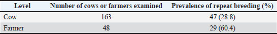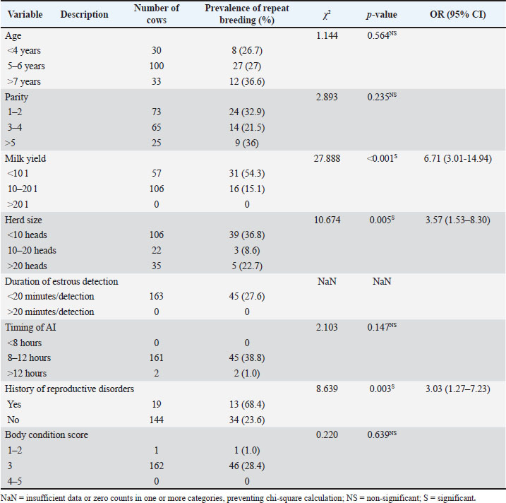 Prevalence of repeat breedingThe prevalence of repeat breeding was 28.8% (47/163) and 60.4% (29/48) at the individual and farmer levels, respectively (Table 1). Analysis of risk factors at the cow levelAt the cow level, where repeat breeding was detected in 28.8%, several risk factors were analyzed to determine the associated factors (Table 2). No significant association (p > 0.05) was observed between factors such as age, parity, timing of AI, and body condition score with repeat breeding. However, milk yield, herd size, and history of reproductive disorders were significantly associated (p < 0.05). Among cows producing less than 10 l of milk per day, 54.3% were repeat breeders, compared with only 15.1% among cows producing 10–20 l of milk per day. Although the overall chi-square test for milk yield was significant (χ²=27.888, p < 0.001), the group producing >20 l/day had no cows and was excluded from the post-hoc analysis. Cows producing less than 10 l/day had 6.71 times the odds of repeat breeding compared with those producing 10–20 l/day. For herd size, repeat breeding occurred in 36.8% of cows in herds with fewer than 10 cows, compared with 8.6% in herds of 10–20 cows and 5% in herds of more than 20 cows. A significant association was found between herd size and repeat breeding (χ²=10.674, p=0.005). Cows in herds with fewer than 10 cows had 3.57 times greater odds of repeat breeding than those in larger herds. Post hoc pairwise comparisons were performed between the three herd size categories (<10, 10–20, and >20 heads), and p-values were adjusted using Bonferroni correction to account for multiple comparisons (Supplementary File). The comparison between cows in herds with fewer than 10 animals and those in herds with more than 20 animals revealed a statistically significant difference, with cows in smaller herds having 3.49 times higher odds of experiencing repeat breeding (OR=3.49, 95% CI: 1.25–9.74; Bonferroni-adjusted p=0.0370). Although the comparison between <10 and 10–20 head herds suggested elevated odds (OR=3.69, 95% CI: 1.02–13.26), it did not remain significant after adjustment for multiple comparisons (Bonferroni-adjusted p=0.1357). No significant difference was observed between the 10–20 and >20 head herd groups (p=1.000). Finally, 68.4% of the cows with a history of reproductive disorders were repeat breeders, whereas only 23.6% of the cows without such a history experienced repeat breeding. A significant association was found between a history of reproductive disorders and repeat breeding (χ²=8.639, p=0.003). Cows with a history of reproductive disorders had a 3.03 times higher chance of repeat breeding than those without a history of reproductive disorders. Analysis of risk factors at the farmer levelDespite the high prevalence of repeat breeding at the farmer level (60.4%), no significant relationships (p > 0.05) were found between the high prevalence of repeat breeding and any variables investigated due to a lack of response variance (Table 3). DiscussionEnrekang Regency has the largest dairy population in the eastern part of Indonesia. However, the Central Bureau of Statistics showed that the population of dairy cows has decreased considerably since 2020, at 1011, 1026, 1016, and 565 heads in 2021, 2022, and 565 heads in 2023 (Central Bureau of Statistics, 2024). This might be due to the typically low reproductive performance of smallholder farms. Yusuf and Sahiruddin (2020) stated that the reproductive performance of dairy cows in Enrekang Regency was 2.05 ± 1.49 times, 214.79 ± 166.35 days, 274.51 ± 5.10 days, and 490.16 ± 167.81 days for service per conception times, interval from calving to conception, duration of pregnancy, and calving interval, respectively. Furthermore, the prevalence of repeat breeding in dairy cows reached 31.57% for primiparous and 29.62% for pluriparous cows in 2021 (Muhuruna et al., 2023). According to the sociodemographic results, which were similar to Nadhira and Sumarti (2017), most farmers were men because women often do not fully control livestock farming in Indonesia, and decision-making by females remains primarily at the household level. The current problem in the agriculture sector is the low youth interest in becoming farmers, with only 4.2% of farmers being old. This condition may threaten the sustainability of future agricultural businesses (Prayoga et al., 2020; Nurlaela et al., 2022). However, in addition to age, education level may influence access to information and understanding of management practices (Athambawa et al., 2021). Owing to the importance of the farm economy, repeat breeding has been intensively investigated in many countries and areas. Juliana et al. (2015) reported a prevalence of repeat breeding in beef Bali cows in Pringsewu Regency of 19.85%, while Nasution et al. (2021) reported a prevalence of 17.3% in beef cattle in North Labuhanbatu Regency. Similarly, Subagio et al. (2019) found a 21.12% prevalence of repeat breeding in Jombang beef cows. Yusuf et al. (2012) and Damayanti et al. (2020) also reported a higher incidence of repeat breeding in dairy cows in Sinjai and beef cattle in Banyuwangi Regency, reaching 62% and 64%, respectively. At the farmer level, the prevalence rate of repeat breeding among dairy cow farmers was 20.64% in Batu and 29.4% in Daerah Istimewa Yogyakarta (Prihatno et al., 2013; Arningdiah et al., 2024). The results showed that the prevalence of repeat breeding in Cendana District, Enrekang Regency, at the cow level (28.8%) was comparable to recent studies by Muhuruna et al. (2023), which observed a 31.57% and 29.62% prevalence for primiparous and pluriparous cows, respectively. In contrast, the prevalence of repeat breeding at the farmer level (60.4%) was significantly higher than that in previous studies. The prevalence of repeat breeding may differ based on the characteristics of the area and sociodemographics. In Indonesian smallholder farms, where