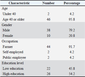 Sociodemographic characteristicsThe sociodemographic characteristics showed that most farmers were 40 years old or older and were dominated by males, as described in Table 4. More than half of the farmers had a high degree of education, although most only worked for a living. Table 4. Sociodemographic characteristics of farmer respondents (n=48) in Cendana district, Enrekang regency, South Sulawesi, Indonesia.