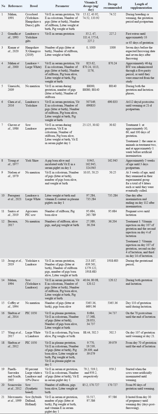 ABSTRACTBackground: Vitamin E is an antioxidant that plays a crucial function in the reproductive processes of pigs. Aim: This study evaluated the reproductive efficacy of ɑ-tocopherol or vitamin E supplementation in pregnant sows. Methods: Twenty-one articles from 1977 to 2021 were included in the database. There were eight parameters observed, such as concentration in the serum during gestation, colostrum concentration, number of piglets per litter at birth, number of stillborn piglets, number of piglets born alive, litter weight at birth, weight of each piglet at birth, and piglet serum concentration on day 1. The data were analyzed using the PROC MIXED procedure in SAS version 9.1. Results: Vitamin E administration in sows led to a statistically significant rise in the level of α-tocopherol in the serum of both sows during gestation and the serum of piglets on the first day after birth. The injection of vitamin E did not yield a statistically significant effect on the observed variables, including an increase in the number of pigs per litter at birth, stillborn piglets, pigs born alive, litter weight at birth, vitamin E levels in colostrum, dan the weight of piglets at delivery. Conclusions: Vitamin E supplements are advisable for female pigs to increase the concentration of α-tocopherol in serum throughout pregnancy and enhance α-tocopherol levels in the serum of piglets on the first day after birth. Keywords: ɑ-Tocopherol, Antioxidant, Pregnancy, Swine. IntroductionVitamin E, a lipid-soluble antioxidant, protects monounsaturated and polyunsaturated fatty acids (PUFA and MUFA) and cholesterol in cellular membranes from free radical damage (Zingg, 2023). This antioxidant exhibits fat-soluble characteristics in cell membranes. Because pigs cannot synthesize vitamin E endogenously, it must be incorporated into their diet (Lauridsen and Litta, 2018). Numerous food sources contain vitamin E, including vegetable oils, fruits, nuts, vegetables, oats, bran, barley, wheat, and palm oil (Neophytou and Constantinou, 2015; Zaaboul and Liu, 2022). Research has demonstrated that vitamin E is essential for reproductive function in both male and female animals and humans (Siddiqui et al., 2021; Md Amin et al., 2022; Gao et al., 2023). Antioxidant properties contribute to the maintenance of normal female reproductive system function (Md Amin et al., 2022). In females, vitamin E influences menstruation, ovulation, oocyte quality, and maturation. Deficiency during pregnancy can result in miscarriage, premature birth, preeclampsia, and intrauterine growth restriction (IUGR) (Siddiqui et al., 2021). Studies on vitamin E supplementation in pigs have yielded different outcomes. Some researchers have observed that supplementing sow feed with vitamin E during gestation increased its levels in serum (Chen et al., 2016; Jeong et al., 2019), colostrum (Chen et al., 2016), piglets born alive (Parraguez et al., 2021), weight at birth, and the number of total piglets born (Kumar et al., 2020). Conversely, other studies have reported no significant effects on vitamin E content in stillbirths, live-born piglets (Becerra, 2017; Santos et al., 2019; Jeong et al., 2019), total number of piglets born, piglet weight at birth, serum piglet weight at birth (Jeong et al., 2019), and piglet weight at birth (Wang et al., 2017; Jeong et al., 2019). Despite these discrepancies, a comprehensive meta-analysis is required. Meta-analysis measures and investigates variations in study results, helping to identify potential sources of bias and apparent discrepancies (Mohapatra and Sengupta, 2016; Tatsioni and Ioannidis, 2024). The primary objective of this study was to conduct a meta-analysis to evaluate the impact of vitamin E oral and injection supplementation in pregnant sows on the reproductive performance of pigs. Materials and MethodsEthics statementsThis study was a meta-analysis review article; therefore, ethical approval was not required. Database developmentThis meta-analysis was conducted in accordance with the Preferred Reporting Items for Systematic Reviews and Meta-Analyses (PRISMA) principles (Hidayat et al., 2020). The data were obtained from publications published between 1977 and 2021. A comprehensive literature search was conducted using keywords such as “Vitamin E,” “ɑ-tocopherol,” “pig,” “sow,” “gilts,” “reproductive performance,” “fertility,” “gestation,” and “pregnant” on search engines including Google Scholar, Scopus, PubMed, ScienceDirect, and Directory of Open Access Journals (DOAJ) to identify relevant articles. Inclusion/exclusion criteriaThe inclusion criteria were as follows: (1) articles published in English by reputable publishers such as Google Scholar, Scopus, PubMed, ScienceDirect, and DOAJ; (2) appropriate experimental design; (3) sufficient experimental and replication materials; (4) pig-specific animal experiments; (5) vitamin E dose in mg/day or convertible to mg/day; (6) reproductive performance parameters; (7) adequate sows (n); and (8) criteria for administering vitamin e orally or by injection. Data extractionInput data from selected articles included author name, publication year, journal name, pig type, number of pigs, vitamin E treatment dose, observed parameters, recommended dose, vitamin E source, parameter units, sampling technique, and measurement techniques. Thirty-three studies on vitamin E supplementation in sows were initially conducted. Twenty-one studies met the inclusion criteria based on titles and abstracts. Vitamin E studies were compiled using assessed variables, including serum gestational vitamin E levels, serum vitamin E levels in piglets on day 1, number of pigs per litter at birth, number of stillborn piglets, number of live-born piglets, litter weight at birth, colostrum vitamin E levels, and piglet weight at birth. Following a comprehensive evaluation, 21 articles were selected and incorporated into the designated databases 