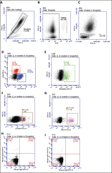 Fig. 1. Separated leukocytes were labeled with fluorescent antibodies and analyzed by flow cytometry. After the exclusion of cell doublets based on forward scatter aria (FSC-A) and forward scatter height (FSC-H) properties (A), viable cells were gated based on negative staining with propidium iodide (PI). (B), Subsequently, a gate was set on lymphocytes based on their FSC and side scatter (SSC) characteristics (C). The populations of CD4+ αβ T cells, CD8+ αβ T cells (D), BAQ44A+ B cells (E), NKp46+ (CD335), natural killer (NK) cells (F), and WC1+ γδ T cells (G) were identified. In addition, isotype control staining with mouse IgG1, IgM, and IgG2a secondary antibodies was performed (H-I).