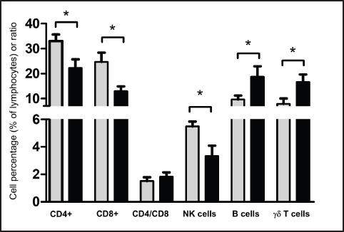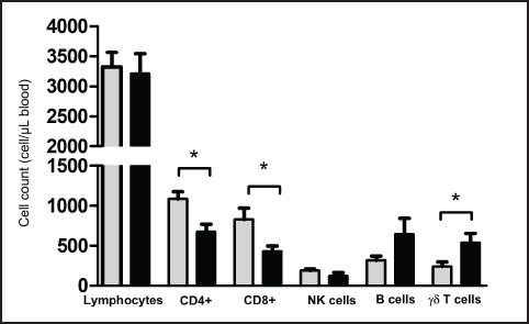 Fig. 2. Frequency of lymphocyte subsets in blood from Pygmy (gray color) and Ardi (black color) goats. Leukocytes were separated from goat blood, labeled with fluorescent antibodies, and analyzed by flow cytometry. The percentages of CD4+ αβ T cells, CD8+ αβ T cells, NKp46+ natural killer (NK) cells, BAQ44A+ B cells, and WC1+ γδ T cells were calculated and presented as a graph. In addition, the CD4 to CD8 ratio (CD4/CD8) was calculated for both goat breeds. Absolute count of blood lymphocyte subsetsThe absolute number of total lymphocytes was calculated after counting leukocytes under the microscope after adding Turk solution to the blood sample (1:10), followed by the multiplication of the lymphocyte percentage with the total white blood cell count. The numbers of total lymphocytes were comparable between the two goat breeds (Fig. 3). Similar to their higher percentages, the absolute numbers of CD4+ αβ T cells and CD8+ αβ T cells were significantly (p < 0.05) higher in the blood from Pygmy goat (1085 ± 92.5 cell/μl for CD4+ and 827.7 ± 142.9 for CD8+ T cells) than those from Ardi goat (678.3 ± 91.3 cell/μl for CD4+ and 430.2 ± 68.8 for CD8+ T cells). In contrast, the number of γδ cells was significantly (p < 0.05) higher in Ardi (540.5 ± 116.2 cell/μl) than in Pygmy (241.5 ± 57.8 cell/μl) goat. The two breeds did not differ (p > 0.05) in the absolute counts of NK and B cells (Fig. 3). DiscussionThe immune response to infection or vaccination is usually associated with changes in immune cell production in the bone marrow and mobilization to tissues, which are reflected by significant changes in the lymphocyte composition of the blood. Therefore, monitoring changes in the distribution of lymphocyte subsets in the blood is one of the most popular methodologies for evaluating the immune system status after infection or vaccination. Species- and breed-specific differences in lymphocyte composition have been reported for several animal species (Faldyna et al., 2001; Macedo et al., 2013; Kim et al., 2016; Yirsaw et al., 2022). In the present study, lymphocyte subsets were identified in blood from two local goat breeds in Saudi Arabia, the Pygmy and the Ardi Saudi goat breeds. In agreement with previous reports on the composition of blood lymphocytes in goats, the results of the present study showed an overall dominance of goat CD4+ T helper cells within blood lymphocytes, followed by comparable percentages of CD8+ cytotoxic T cells, BAQ44A+ B cells, and γδ T cells, and a less frequent fraction of NKp46+ NK cells (Kaba et al., 2011; Totte et al., 2002; Bezos et al., 2012). According to Baliu-Pique et al. (2019), T helper cells are the predominant subset in neonatal and young goat kids, while CD8+ T-cells predominate in the blood of adult animals (Baliu-Pique et al., 2019). The comparison of lymphocyte composition among the goat breeds identified significant differences in the numbers of helper and cytotoxic αβ T cells as well as γδ cells. The capacity of Pygmy goats to resist infectious pathogens such as Trypanosomes has been described in the literature (Chiejina and Behnke, 2011). Higher numbers of both helper and cytotoxic T cells indicate different immune responsiveness of the two goat breeds to extracellular and intracellular pathogens, respectively. To confirm the clinical significance of these results, further studies should focus on the comparative immune responses of the two breeds to experimental infections with distinct intracellular or extracellular pathogens. Several studies have linked breed-specific immunophenotypes to resistance or susceptibility to infectious diseases (Sayers et al., 2008; Corripio-Miyar et al., 2022; Makau et al., 2020). A study by Barbour et al. (2012) identified significant differences between local and imported Saanen goats regarding lymphocyte composition and immune response (Barbour et al., 2012). The authors linked the higher frequency of CD8+ T cells to higher immune responsiveness toward intracellular pathogens. Age-related changes in the maturation status of the goat immune system have been reported in the scientific literature (Baliu-Pique et al., 2019; Koets et al., 2019; Abdelsattar et al., 2021). The present study was limited by the narrow age range of the animals, with all goats aged between 4 and 8 months. An additional limitation of the study is the small number of animals. Therefore, further studies with animals of different ages could be conducted to determine whether the observed differences would still exist among animals of different ages.