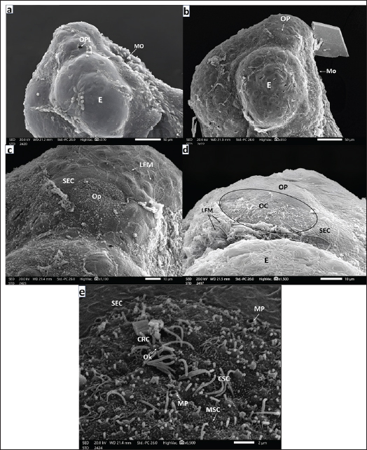 Fig. 2. a. SEM micrograph of the head of a seabass fry (35 days post-hatching) showing: Deepening olfactory pit (OP) above the mouth orifice (MO) and just anterior to the eyes (E) (Scale bar 200 µm). b. SEM micrograph of the deepening olfactory pit (OP) of a seabass fry (35 days post-hatching) Showing that it is bounded by SEC with labyrinthic microridges (LFMs) (Scale bar 50 µm).c. SEM micrograph of the olfactory pit (OP) bottom of seabass fry (35 days post-hatching) showing: Ciliated CRC, microvillous MRC both with their olfactory knob (OK) among ciliated CSCs with disarrayed long KC, mcrovillar MSC, and mucous cell pores (MP) (Scale bar 5 µm). d. Higher magnification SEM micrograph of the olfactory pit (OP) of seabass fry (35 days post-hatching) showing: CRC with short thick cilia emitted from the olfactory knob (OK), ciliated CSCs of long thin KC and mucus droplet (MD) (Scale bar 1 µm). e. Higher SEM micrograph at the periphery and around the olfactory pit (OP) of a sea bass fry (35 days post- hatching) showing: that this non-sensory area is packed with mucous cell pores (MP) among flattened SECs with their labyrinthic microridges (LFMs) (scale bar 10 µm). European seabass fingerlingsAt 90 days post-hatching, the European seabass fingerlings (3.5 cm) exhibited major developmental changes, with the formation of olfactory cavities (OCHs) and two nostrils. Seven OLs began to form olfactory rosettes (ORs). The left rosette was more developed and had a prominent lingual protrusion (LP; Fig. 4b), whereas the right rosette was less developed (Fig. 4c). The surrounding NSA was made of SECs with LFM and contained MP (Fig. 4d). The sensory area (SA) is populated by CSCs with KC and rare CRCs and MRCs (Fig. 4e, 4f). The NSA was primarily composed of GMCs and MPs interspersed between flattened SECs (Fig. 4g).