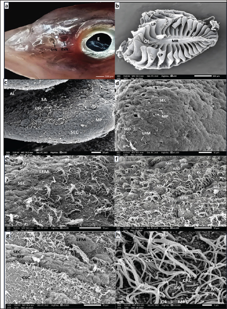 Fig. 5. a. Photograph of a seabass juvenile’s head (9–12-month post-hatching) showing: Complete separation of the two nostrils by the broad nasal bridge (NB) into a small rounded elevated anterior InN and a wider rounded flattened posterior ExN in front of the eye (E) (Scale bar 500 µm). b. SEM micrograph of an olfactory rosette of seabass juveniles (9-12-month post-hatching) showing: Well-developed 31 OL with prominent LP. Arranged on both sides of an elongated well-developed MR (Scale bar 500 µm). c. SEM micrograph of the LP of an OL and adjacent another one of seabass juveniles (9–12-month post-hatching) showing: The most marginal area with SECs and MPs in-between, followed inward with a transitional area of CSCs and thence sensory area SA in addition to the LP of adjacent lamella (AL) (Scale bar 20 µm). d. SEM micrograph of the LP peripheral edge with almost nonsensory epithelium of seabass juveniles (9–12-month post-hatching) showing: many mucous cell pores (MP) dispersed among the main constituents of SEC masses characterized by labyrinthic LFM. Notice the extruded mucus droplets (MD) (Scale bar 10 µm). e. SEM micrograph of the OL of seabass juveniles (9–12-month post-hatching) in the transitional zone between sensory and nonsensory areas but little to the latter showing: Aggregation of SECs penetrated with MP of GMCs as well dispersed MSCs and CSCs, but sensory receptor cells (SRCs) are hidden among disarrayed KC of CSCs (Scale bar 10 µm). f. SEM micrograph of the OL of seabass juvenile (9–12-month post-hatching) in the transitional zone but more in the sensory area showing: In addition, aggregation SECs dispersed in isolated islets penetrated with MP of GMCs. but the SRCs are hidden also among disarrayed thin long KC of CSCs (Scale bar 10 µm). g. SEM micrograph of the OL of seabass juvenile (9–12-month post-hatching) also in a transitional zone showed: CSCs with disarrayed KCs appeared in islets in between extending strands of flattened SEC aggregations penetrated with MP, but the seldom detected SRCs may be hidden too among copious of thin long KCs of CSCs (Scale bar 10 µm). h. Magnified SEM micrograph of lamella’s sensory area of a seabass juvenile (9–12-month post-hatching) showing: CRCs with short sensory cilia, MRCs with minute microvilli, both the two cells are with OK and hidden among copious KC of CSC (Scale bar 1 µm).