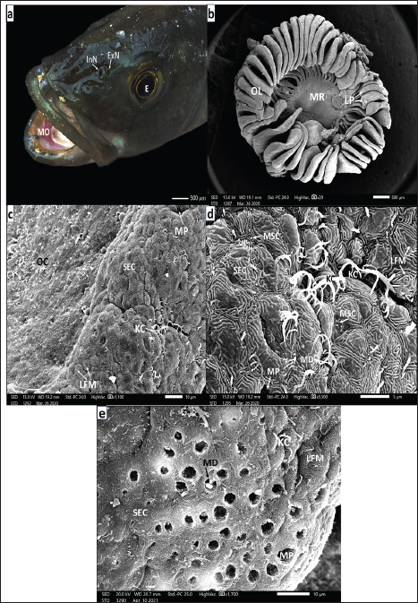 Fig. 6. a. Photograph of a full-grown seabass’s head (3 years old) showing: The left pair of nostrils, anterior outstanding of the elevated back margin InN, and posterior almost wider flat ExN above and in front of the eye (E) and above the posterior corner the mouth (MO) (Scale bar 500 µm). b. SEM micrograph of an olfactory rosette of full-grown seabass (3 years old) showing: Olfactory rosette of 38–40 lamellae (OL) with prominent LP. The lamellae are arranged around the oval MR (Scale bar 500 µm). c. Magnified SEM micrograph of the nonsensory olfactory epithelium covering the periphery of the OL of adult seabass (3 years old) showing; Mucous cell pores (MP) and very little disarrayed thin KC dispersed in-between masses of SECs with their prominent LFM. Inwardly, the transitional zone of undifferentiated OCs (Scale bar 10 µm). d. More magnified SEM micrograph of the previous nonsensory epithelium covering the olfactory lamella’s periphery of the seabass showing; MPs, MSCs, and very little long KC of CSCs dispersed in-between masses of SECs with their labyrinthic LFM (Scale bar 5 µm). e. Magnified SEM micrograph of the most periphery of the OL of adult seabass (3 years old) showing: Abundant MP, some with MD dispersed among masses of SECs with their prominent LFM, and very little KC of hidden CSCs (Scale bar 10 µm).