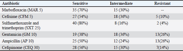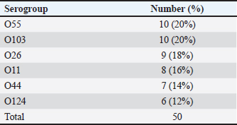 Analysis of PCR products At room temperature, the products of PCR were separated by electrophoresis on 1.5% agarose gels (Applichem, Germany, GmbH) in 1× TBE buffer at 5 V/cm. For gel analysis, a gene ruler 100-bp ladder (Fermentas, Thermo, Germany), melilot 100-bp and 100-bp plus ladders (Qiagen, Gmbh, Germany), and Genedirex 50-bp DNA ladder RTU (Cat. No. DM012-R500) were used to determine the fragment sizes. The gel was photographed (Alpha Innotech, Biometra) and analyzed by computer software. Detection of minimum inhibitory concentration (MIC) of marbofloxacin and LF using the Broth dilution method:Preparation of bacterial inoculum Escherichia coli strain O55 was sub-cultured onto EMB agar plates and incubated at 37°C for 24 hours. 3–4 colonies were selected, inoculated in tryptic soy broth, and then incubated at 37°C for 2–6 hours. Suspension turbidity was balanced to coordinate with 0.5 McFarland standards and then diluted to obtain a concentration of 105 CFU/ml approximately (Owuama, 2017). LF preparation Pure LF (Sigma Chemical Co.) was purchased. The following concentrations of LF solution were prepared, (5, 4, 3, 2, and 1 mg/ ml) in distilled water, sterilized by a 0.45-mm filter, and freshly used (Al Habty and Ali, 2023). Preparation of marbofloxacin antibiotic Marbofloxacin was diluted to different concentrations (5, 6, 7, 7.5, 9, 9.5, 9.8, 10, and 15 μg/ml) in distilled water in test tubes. 100 μl of bacterial concentration 105 CFU/ml were added to the prepared LF and marbofloxacin concentrations. The inoculated tubes and the positive control tube (tubes containing broth only without any treatment) were incubated at 37°C for 24 hours. To determine the MIC, 100 μl of each clear tube was spread onto EMB agar and incubated at 37°C for 24 hours. The bacterial count was also recorded. The MIC is the lowest concentration of an antimicrobial agent that suppresses microbial growth (90%. The minimum bactericidal concentration (MBC) is the lowest antimicrobial concentration required to kill microorganisms. The mean MIC was calculated from triple readings for each test (Andrews, 2001). The MICs of both LF and marbofloxacin were added to 100 μl of bacterial concentration 105 CFU/ml in a sterile tube to assess the synergistic effect of marbofloxacin and LF. Treatment of infected patientsThe 50 BM cases were allocated randomly in two groups (A) and (B), each consisting of 25 cases. Group (A) received marbofloxacin (marbocyl ®) (1 cm/50 kg bw) for 3 days, and LF (2 gm intramammary every 12 hours) for 3 days. Group (B) received marbofloxacin (marbocyl ®) 1 cm / 50-kg bw) for 3 days. The two groups were injected with the nonsteroidall anti-inflammatory drug flunixin meglumine (finadyne®) at a dose of 1 cm/50 kg bw for three days. Follow-up of cases to evaluate treatment outcomeThe two groups were evaluated during the first week and two months after treatment to determine the efficacy of the treatment as follows: Clinical examination: systemic clinical signs were monitored (Heart rate, rectal temperature, rumen motility, appetite, and general attitude). The udder was palpated for soreness, swelling, and hardness. The milk was inspected for clotting, color changes, and sourness at each milking. CMT was performed. Bacteriological examination: E. coli enumeration and bacterial counts were recorded. Statistical analysisThe obtained data were statistically analyzed to calculate the mean, SD, and p values using the independent sample t test and SPSS program according to (Snedecor and Cochran, 1980). Ethical approvalThis study was approved by the Institutional Ethics Committee and was conducted in accordance with local laws and regulations. The study was approved by the Medical Research Ethics Committee, Faculty of Medicine, Sohag University (OHRP #: IRB00013006) and was performed according to the Interdisciplinary Principles and Guidelines for the Use of Animals in Research, Testing, and Education by the New York Academy of Sciences, Ad Hoc Animal Research Committee. Table 2. Serotypes of E. coli strains isolated from BM animals.