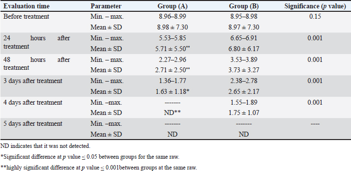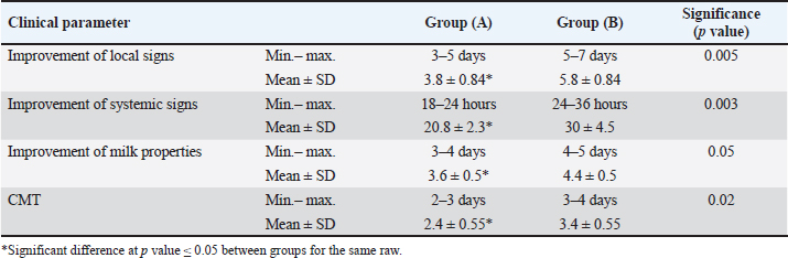 ResultsOf the 80 examined BM animals, 50 were positive for E. coli (62.5%). Thirty East coli strains were isolated from buffaloes and 20 E. coli strains were isolated from cattle. Six serogroups were identified: O55 and O103 (20% each), followed by O26 (18%) and O124 (12%) (Table 2). Antibiotic sensitivity testing of 50 E. coli isolates revealed that all isolates were sensitive to marbofloxacin. The isolates showed resistance to gentamicin and ampicillin (26% each), cefquinome (14%), cefixime (10%), and SuLFamethoxazole and trimethoprim (4%) (Table 3). Molecular identification by PCR confirmed that all 50 isolates of E. coli were positive for the 16S rRNA gene. All beta-lactam-resistant isolates carried the BlaTEM gene. All suLFonamide-resistant isolates encode Sul1. All aminoglycoside-resistant isolates carried the aadB gene. The qnrS gene was not detected in any E. coli isolates (Fig. 1). The broth dilution method revealed that the MIC of marbofloxacin was 6 µg/ml with a bacterial count of 4.16 log cfu/ml and MBC was 7 µg/ml, whereas the MIC of LF was 2 mg/ml with a bacterial count of 4.41 log cfu/ml and MBC of 3 mg/ml. No growth was detected when the marbofloxacin (6 µg/ml) was combined with LF (2 mg/ml) (Table 4). Group (A), which received LF intramammary infusion with marbofloxacin, showed significant improvement in BM compared with group (B), which received marbofloxacin alone. Local soreness and edema in the udder improved within 3–5 days in group (A) and 5–7 days in group (B). Systemic signs improved within 18 to 24 hours in group (A), and within 24 to 36 hours in group (B). Milk properties returned to normal levels within 3–4 days in group (A), and 4–5 days in group (B). CMT returned to the normal level after 2–3 days in group (A), and 3–4 days in group (B) (Table 5). There was a significant decrease in the E. coli count in group (A) compared with group (B). The E. coli count could not be detected after 4 days in group (A) and after 5 days in group (B) (Table 6). Re-evaluation of BM cases after 2 months revealed no recurrence in group (A), whereas recurrence occurred in three cases in group (B). Table 3. Antimicrobial resistance profiles of E. coli isolated from BM animals.