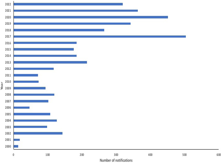 Fig. 1. RASFF notifications for all hazards in poultry meat and poultry meat products imported by European countries from different countries around the world (including EU members) from 2000 to 2022. Based on risk decisions, the most decisions taken was serious (n=2,243, 54.26%), while not serious notifications were considered (n=695; 16.81%). The highest number of notifications was for poultry foods imported from Poland (n=1,208), followed by Brazil (n=975, Table 2). As non-European countries, Brazil and Thailand constituted the countries with the highest number of notifications (n=1216, 29.41%). In total, poultry foods exported by these two countries represented (91.82%) of the border rejection notification type (Table 1). The EU countries of Poland, France, Germany, Belgium, the Netherlands, and Hungary represented the origin of the total notifications (n=2,187; 52.9%). However, very few notifications were reported for poultry foods imported from Canada, Croatia, Saudi Arabia, India, and Malta (Table 2). Notifications were reported by a total of 31 notifying countries in addition to the European Commission. The highest number of notifications was recorded by the Netherlands (n=615; 14.8%), Poland (n=465; 11.2%), and Denmark (n =373; 9%) (Table. 2), while the least notifications were reported by Slovenia, Romania, Hungary, Greece, Portugal, Malta, Switzerland, Luxembourg, Cyprus, European Commission, Iceland, and European services (a total of only 169 notifications were reported by previously mentioned countries over the two decades of the study). Regarding the actions taken, the majority of reported poultry foods were withdrawn from the market (n=522; 12.62%), import was not authorized (474; 11.46%), or re-dispatched to the originating country (n=457; 11.05%) (Table 1). The most common actions related to notifications from Brazil and Thailand were imports that were not authorized and re-dispatched (Fig. 3). However, withdrawal from the market was the most taken action in response to RASFF notifications originating from EU countries such as Poland, France, Germany, and Belgium (Table 3). Table 1. RASFF notifications of variable hazards in poultry meat and poultry meat products (n=4,134) originating from different countries around the world (including EU members) from 2000 to 2022 based on notification category