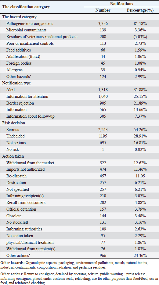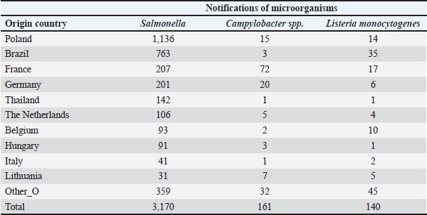 AbstractBackground: The European Commission developed the Rapid Alert System for Food and Feeds (RASFF) as a monitoring and reporting tool for food safety risks and consumer protection among the European Union (EU) and the European Economic Area member states. Aim: This study evaluated the notifications of variable hazards on poultry meat and poultry meat products originating from global supply chains to the EU between 2000 and 2022 by analyzing notifications and alert incidences on the RASFF database. Methods: A total of 4,134 notifications were evaluated and analyzed, such studies were reported by 32 countries due to the presence of pathogenic microorganisms, residues of veterinary medicinal products, microbial contaminants, feed additives, and adulteration in addition to poor or insufficient controls from 48 countries worldwide. Results: The highest number of notifications was for poultry meat and poultry meat products imported from Poland (n=1,208; 29.22%) and Brazil (n=975; 23.58%). Among all reported notifications, pathogenic microorganisms were the most predominant (n=3,356; 81.18%) across the variable categories of hazards. Salmonella was the most notified pathogen (n=3,170; 76.68%). According to notification type, alert represented (31.88%), followed by border rejection (21.89%), and based on risk decisions, the vast majority of cases (54.26%) were considered as serious. The main measures taken in response to notifications were withdrawal from the market (12.62%) and import not authorized (11.46%). Conclusion: The results revealed that imported poultry meat and poultry meat products are potential vehicles for clinically relevant risks, including microbial and chemical hazards. Keywords: RASFF, Notifications, Poultry meat products, European Union. IntroductionWorldwide, poultry is the most consumed type of animal protein (OECD-FAO, 2021). According to Fuseini et al. (2023), poultry meat has a low-fat content, is more versatile, is inexpensive, and is easier to cook than other types of meat. In terms of global food imports, the European Union (EU) is ranked second (Jansen et al., 2018). Although international trade increases access to foods derived from animals, other countries worry about food safety breaches and the possibility of zoonotic infections (Attrey, 2017). Numerous elements, such as chemical pollutants and biological dangers, may render food unsuitable for human ingestion (Borchers et al., 2010). The number of incidents of food poisoning has been increasing in recent years worldwide; in fact, experts estimate that 600 million people get sick from food poisoning every year. Every year, over 23 million cases of food poisoning cause 4,500 fatalities and over 400,000 disability-adjusted life years in Europe. The transmission of pathogenic microorganisms such as Salmonella spp., Campylobacter spp., and Listeria monocytogenes can be facilitated by poultry meat and poultry products, according to epidemiological studies (Gonçalves-Tenório et al., 2018; European Food Safety Authority and European Center for Disease Prevention and Control, 2019). The majority of salmonellosis infections, whether sporadic or spillover, originate from poultry (Pires et al., 2011). The European Food Safety Authority identified Salmonella spp. as a pathogen of high concern when inspecting poultry flesh (EFSA, 2012). In addition, according to EFSA (2010), poultry is a common source of Campylobacter spp., which pose a foodborne risk. This is mostly due to cross-contamination with ready-to-eat foods. Approximately 20%–30% of human Campylobacteriosis cases are thought to be caused by broiler meat in some way, shape, or form; however, 50%–80% of these cases may be associated with the entire chicken as a reservoir (EFSA, 2012). According to Gonçalves-Tenório et al. (2018), poultry and other ready-to-eat meals are common sources of listeriosis. There is a need to consider the potential danger to public health posed by chemical pollutants, veterinary product residues, and illegal substances found in food products. Bouzembrak and Marvin (2016) cited food theft as another cause for rejecting EU-delivered food. In addition, between 1998 and 2015, the EU listed the presence of foreign entities in food items as a reason for rejection (Djekic et al., 2017). The EU is a key hub for all its commercial partners throughout the globe. Between 2000 and 2018, there was relatively little change in the percentage of agrifood commerce involving animal products, which accounted for 16% of the overall trade (Chatellier, 2021). This percentage did not include trade within the EU. With 23% of the world’s total exported animal products, the EU is by far the top exporter. The majority of the world’s meat supply comes from chicken and other poultry. In recent years, the United States has been the leading producer, followed by China (16.3%), Brazil (10.9%), and the EU (12.0%), according to data compiled by the Food and Agriculture Organization (FAO) and the Organization for Economic Co-operation and Development (OECD), 2020. In their 2020 forecast, the OECD and the FAO predicted that global poultry meat supplies would rise by 20.3 million tons from 2019 to 2029. According to Chatellier (2021), the top nations in the world that import chicken meat are Japan (16%), the EU (11%), China (10%), Saudi Arabia (5%), and Mexico (5%). The EU is the world’s second largest food importer; therefore, it is crucial that everything that comes into the country meets the stringent quality requirements set by the EU (Jansen et al., 2018). That is why rules and regulations have to be in place for animal products to be imported into the EU from outside the EU. The European Commission developed the Rapid Alert System for Food and Feeds (RASFF) as a notification and monitoring tool. It is an online platform that gathers datasets linked to food safety for EU members. This paves the way for EU and European Economic Area nations to address fo