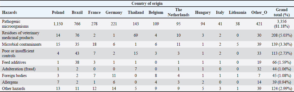 However, the notifications due to residues of veterinary medicinal products were 208 (5.03%) of the total notifications, representing the highest number of recorded hazards following the number of pathogenic microorganism notifications (Table 4). The highest number of notifications due to residues of veterinary medicinal products was for poultry meat and poultry meat products originating from Brazil (1.83%) and Thailand (1.66%). The least commonly notified hazards were use-by-date exceeding, Shiga toxin-producing E. coli, and mold infestation (Table 4). DiscussionPoultry meat is the first type of meat produced and consumed in the world (Chatellier, 2021). The presence of pathogenic microorganisms, microbial contaminants, and chemical residues in food products, particularly poultry meat foods, represents a high risk to public health. In this study, we investigated the notifications related to microbial and chemical hazards in poultry foods imported by the EU between 2000 and 2022. The notifications of poultry imports to EU countries increased from (14 ~ 184) notifications annually between 2000 and 2016 to 504 in 2017 and 319 in 2022. This growing notification trend could be due to increased production and world trade of poultry foods over the years (OECD-FAO, 2020) and also could be related to climate change, especially for microbial notifications (Milazzo et al., 2016; Maggiore et al., 2020).