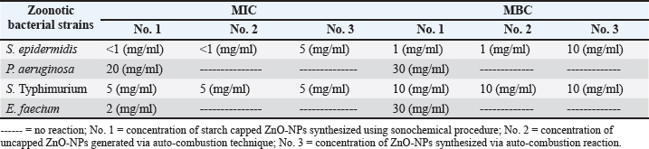 AbstractBackground: Cattle mastitis is a widespread and affluent illness that threatens the dairy industry. Numerous common infectious diseases, mostly zoonotic, impact Egypt’s dairy cow production. According to their remarkable affordability, high safety, and biocompatibility, and their exceptional effectiveness against microbes, zinc oxide nanoparticles (ZnO-NPs) have shown great promise in biomedicine, particularly in the areas of antibacterial and anticancer treatment, and so have become the most broadly used nanoparticles of metal oxides in various biological treatments throughout the last 20 years. Aim: The present study emphasized the potential for dispersed, non-agglomerated ZnO-NPs produced by sonochemical irradiation with starch serving as a capping agent to be considered more economical and effective germicidal agents in the eradication of bacteria of bovine mastitis, such as Staphylococcus epidermidis, Pseudomonas aeruginosa, Salmonella enterica serovar Typhimurium (S. Typhimurium), and Enterococcus faecium. Methods: To improve their antibacterial effectiveness against specific zoonotic pathogens that can cause bovine mastitis, three suspensions of ZnO-NPs were created as follows: auto-combustion reaction-synthesized ZnO-NPs, auto-combustion reaction-prepared uncapped ZnO-NPs, and sonochemically prepared starch-capped ZnO-NPs. The three suspensions were exposed to the zoonotic pathogens S. epidermidis, P. aeruginosa, S. Typhimurium, and E. faecium at concentrations ranging from 1 to 50 mg/ml. Results: The prepared three nano-ZnO suspensions showed minimum bactericidal concentration (MBC) total suppression of S. epidermidis at doses of 1–10 mg/ml of nano-ZnO and minimum inhibitory concentration (MIC) against S. epidermidis at concentrations <1–5 mg/ml. According to the suspension (No. 1), MBC was detected at a concentration of 30 mg/ml, and the MIC was 20 mg/ml for P. aeruginosa. Concerning S. Typhimurium, the MIC was found at a concentration of 5 mg/ml, while MBC was measured at 10 mg/ml. Lastly, at a concentration of 30 mg/ml, the nano-ZnO suspension (No. 1) demonstrated MBC activity against E. faecium, with MIC activity at a concentration of 2 mg/ml. Conclusion: This point will be useful for future research on ZnO-NPs because it focuses on their biological and antibacterial applications. Keywords: Zoonoses, Bovine mastitis, Zinc oxide nanoparticles, Egypt, Antibiotic residues.. IntroductionDiseases that naturally spread from vertebrates to humans and vice versa are known as zoonotic diseases (Eissa and Harb, 2023; Zin Eldin et al., 2023; Bedair et al., 2024; Eissa, 2024a,b,c; Elgendy et al., 2024; Elsobky et al., 2024; Salman et al., 2024a,b; Zain Eldeen et al., 2024; Ramzy et al., 2025). Mastitis, specific to the bovine mammary glands where inflammation or infection occurs, is a popular, prevalent disease threatening dairy farms globally. It reduces milk production and causes significant financial losses because of the high expense of treatment and the requirement to discard possibly contaminated milk (Eissa and Harb, 2023; Salman et al., 2024a). The two main types of inflammatory response in the parenchymal tissue of the mammary gland are symptomatic clinical mastitis (CM) and asymptomatic subclinical mastitis (SCM). These criteria are based on pathological signs (Prajapati et al., 2024). Furthermore, by consuming milk, mastitis-affected animals can spread harmful infections to humans, a public health risk that necessitates indirect diagnosis (Ahmed et al., 2020). In order to prevent and treat mastitis, adult dairy calves are also given a lot of antibiotics, which has a detrimental effect on the health of consumers (Ruegg, 2017; Byomi et al., 2018, 2019b; Eissa and Harb, 2023; Salman et al., 2024a,b; Zain Eldeen et al., 2024). In Egypt, Azooz et al. (2020a) calculated that the yearly economic losses as a result of CM were 1,196,871.4 LE because of direct and indirect failure and preventive expenses. While they calculated expenditures associated with medications, rejected milk, decreased milk yield, and veterinary services to prevent conversion to CM, labor, product quality, diagnostics, culling, materials, and investments were all included in the 21,933,258.60 LE for SCM that they recorded as annual cost loss. Based on how the pathogens are passed on, there are two types of zoonotic bovine mastitis: zooanthroponotic [from humans to animals, such as Pseudomonas aeruginosa and Salmonella enterica serovar Typhimurium (S. Typhimurium)] and anthroponotic (from animals to humans, such as Staphylococcus epidermidis and Enterococcus faecium) (Prajapati et al., 2024). To stop and manage the onset and spread of dairy foodborne zoonoses, Egypt and others must place a high priority on knowledge assessment and awareness (Fagnani et al., 2021). In some instances, S. Typhimurium usually spreads in a herd through an animal’s feces, but it can also be passed on through the milk of mastitic and asymptomatic shedders, making it more likely that other animals will get sick (Holschbach and Peek, 2018). In addition, P. aeruginosa bacteria have been found in dairy mastitic cows in both clinical and subclinical studies (Meng et al., 2025). Bovine pseudomonas mastitis can cause fever, severe toxemia symptoms, watery, clotted, or bloody milk, and swollen and red mammary glands. It can also manifest as long-lasting illnesses with high somatic cell counts (SCC). The most common progression starts with moderate mastitis and ends with persistent infection (Kawai et al., 2017). Conversely, the most prevalent zooanthroponotic pathogen that causes bovine CM and SCM with high SCC is S. epidermidis, one of the coagulase-negative staphylococci members (Kløve et al., 2025). The function and impact of these pathogens on the health of the mammary glands are little understood, despite their obvious significance for the quality of dairy products and animal welfare (De Buck et al., 2021). Additionally, E