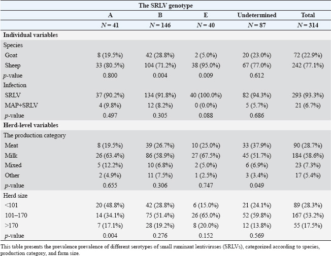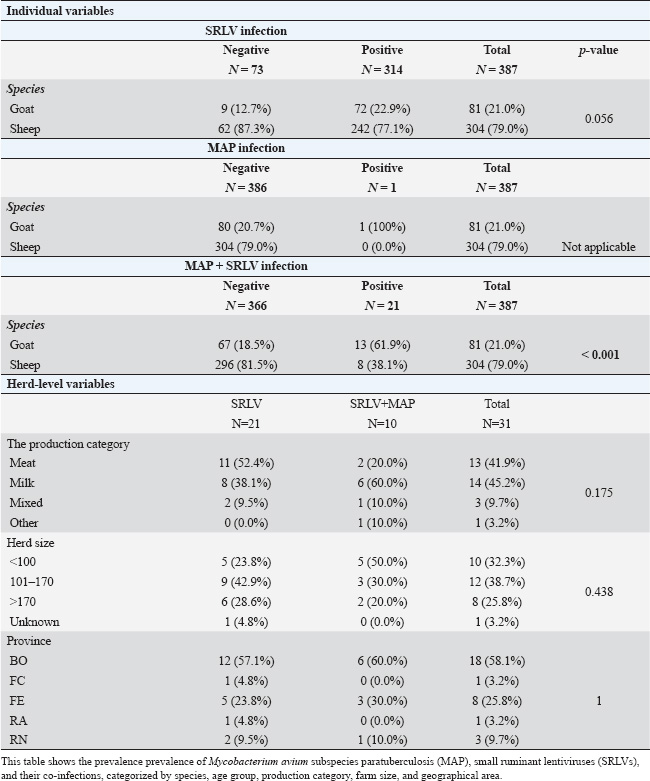 Regarding the prevalence at the herd level, only the “between-herd” prevalence could be calculated because the samples were not fully representative. The observed prevalence was 67.7% for SRLV and 32.3% for coinfection. Although these results are not representative of the entire region, they provide a useful overview for a general assessment of the situation. The patterns observed can guide targeted control measures, inform management practices, and improve disease surveillance. However, further studies are needed to elucidate the mechanisms behind genotype-specific interactions, age-dependent susceptibility, and regional variations. In addition, longitudinal studies can provide insights into disease dynamics over time and the effectiveness of interventions. The major limitation of this study was the lack of a consistent distribution of animals in terms of age, production category, geographical area, and herd size. Additionally, the nature of the samplings (“convenience samplings”) did not allow a systematic selection of the animals. A further limitation concerns the absence of Se and Sp values for Eradikit, which precluded the possibility of performing an accurate analysis of the true prevalence. Despite these limitations, the collected data provide a good basis for understanding MAP, SRLV, and their interactions. ConclusionResearch focusing on SRLV and MAP co-infection in small ruminants remains limited, and even fewer studies have addressed the co-occurrence of infectious diseases of viral and bacterial origin. Although our study was limited by the small sample size and the heterogeneity in the selection of subjects, the preliminary results were remarkable. The epidemiological characteristics of the two pathogens, in agreement with the results of other studies, suggest associations with various factors, including animal-related aspects such as species involvement and management practices specific to Italian small ruminant production in Italy. By comprehensively analyzing these interrelated aspects, we aim to contribute to the development of more targeted and effective measures to safeguard the health and productivity of sheep and goats while addressing the complex challenges posed by these pathogens within the livestock industry. In conclusion, despite the inherent limitations of the study, due to the small sample size and the type of sampling, the results obtained provide a significant contribution to the prevalence of SRLV and MAP, as well as co-infection in small ruminants in the Emilia–Romagna region. Of particular interest is the detection of SRLV genotype E in a goat population, which was documented here for the first time. Although these results are preliminary, they provide a basis for further studies to understand the complex interactions between these pathogens and their impacts on sheep and goat flocks. In addition, the results can be used as a starting point for the development of biosecurity checklists aimed at controlling these diseases. AcknowledgmentsWe acknowledge the support and collaboration of the University of Bologna and the Local Health Unit Company (AUSL) of Bologna in carrying out this study. Special thanks to the participants who provided the serum samples and to the farm owners who allowed us to evaluate their control measures. Conflicts of interestThe authors declare that there are no conflicts of interest regarding the publication of this article. FundingThis research received no specific grant from any funding agency in the public, commercial, or not-for-profit sectors. Authors’ contributionsConceptualization, S.P., Methodology, E.M., M.R., S.P., and L.P., Data Curation, E.M., M.R., R.S., Writing – Original Draft Preparation, E.M., Writing – Review & Editing, E.M., S.P., and R.S., Visualization, R.S., E.E., S.P., L.P., S.P., M.R., Supervision, S.P., Project Administration, S.P. Data availabilityThe data that support the findings of this study are available from the corresponding author upon request. Informed consent statementAll the information and samples were collected as part of a practice activity of the Veterinary Medicine Degree Course of University of Bologna, for which an agreement with the owner was established, including consent about any research or scientific publication of the data collected. ReferencesAgnello, S., Purpari, G., Lo Giudice, C., Campo, F., Chiaracane, G., Coniglio, A., Stancanelli, A., Feliziani F., Dara, S. and Guercio A. 2012. Artrite – Encefalite Caprina (CAE) in allevamenti da latte nel territorio siciliano. Large An. Rev. XX Congresso nazionale S.I.P.A.O.C. (Società Italiana di Patologia ed Allevamento degli ovini e dei caprini), 5, 68, 2018. Agnello, S., Stancanelli, A., Campo, F., Feliziani, F., Caracappa, S., Purpari, G. and Guercio A. 2011. Artrite-Encefalite Caprina (CAEV) una patologia emergente nel territorio siciliano: programma volontario di eradicazione. In Atti Istisan Congressi 11/C3 del IV Workshop Nazionale di Virologia Veterinaria. Arcangeli, C., Torricelli, M., Sebastiani, C., Lucarelli, D., Ciullo, M., Passamonti, F., Giammarioli, M. and Biagetti M. 2022. Genetic characterization of small ruminant lentiviruses (SRLVs) circulating in naturally infected sheep in Central Italy. Viruses 14(4), 686; doi:10.3390/v14040686. Arsenault, J., Dubreuil, P., Girard, C., Simard, C. and Bélanger, D. 2003. Maedi-visna impact on productivity in Quebec sheep flocks (Canada). Prev. Vet. Med. 59(3), 125–137; doi:10.1016/s0167-5877(03)00086-2. Attili, A.R., Victor, N.N., Silvia, P., Luciana, P., Anastasia, D. and Vincenzo, C. 2011. Ovine paratuberculosis: a seroprevalence study in dairy flocks reared in the marche region, Italy. Vet. Med. Int. 2011, 782875; doi:10.4061/2011/782875. Bakker, D. 2010. Paratuberculosis control measures in Europe. In Paratuberculosis: organism, disease, control. Eds., Bher M.A. and Collins D.M., Preston, UK: CAB Int, pp: 306–315. Barquero, N., Domenech, A., Arjona, A., Fern