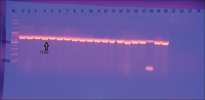 Fig 1. Gel electrophoresis of the 16S rRNA amplicon of S. aureus on (1%) agarose at 100 volt for1 hour M: DNA Marker 2,000 bp/ show the positive results for this gene with amplicon size 711 bp. Ethical ApprovalAll procedures in this study were approved by the Animal Ethics Commission of the School of Veterinary Medicine (certificate number 2326) on 29/5/2024. ResultsIsolation and Identification of S. aureusAll bacterial isolates in the current study were identified using morphological and biochemical tests, as described by Brooks et al. (2010). Genotypical identification of isolates was performed using the 16s rRNA gene (the marker of S. aureus ), which was detected in all identified isolates as shown in Figure 1. A total of 168 human urine samples and 172 cow urine samples were used in our study. Human urine samples were collected from hospitalized patients. Out of the 168 samples, 24 (14.2%) were diagnosed as S. aureus-positive strains, as shown in Figure 2. From 172 cows’ urine samples, 16 (9.3%) were positive for S. aureus (Fig 2). Antibiotic susceptibility patternOut of 24 tested isolates, the following susceptibilities were detected: with regard to human source isolates, complete susceptibility (100%) was observed for TG and LZD, and 91.7% for nitrofuran. The most resistance rates of the isolates were PG 100%, PT, and OX 91.6%, and E 83 %. On the other hand, different levels of resistance were observed for other antibiotics, such as T (66.6%), CD (60%), FD 58.3 %, RA, LEV, and TS 50%), TE and V 41.6 %, GM, MXF, and TOB 33% (Fig 3).