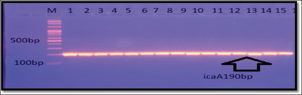 Fig. 6. Gel electrophoresis of icaA amplicon of S. aureus on (1%) agarose at 100 volt for 1 hour/M: DNA Marker 2,000 bp/ show the positive results for this gene with amplicon size 190 bp.