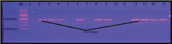 Fig. 9. Gel electrophoresis of fib amplicon of S. aureus on (1%) agarose at 100 volt for 1 hour /M: DNA Marker 2,000 bp/ show some positive results for this gene with amplicon size 435 bp. Antibiotic susceptibility patternAntibiotics have the ability to disrupt the peri-urethral flora, permitting uropathogens to thrive and enter the urinary system. Furthermore, this state gives bacteria the chance to exchange their genetic material containing antibiotic-resistant genes via horizontal gene transfer (Ouno et al., 2013). Microorganisms undergo mutations in either their chromosomal DNA or RNA to survive, which may lead to the emergence of resistance to several antimicrobial agents. The bacterial cell wall plays a critical role as a barrier, but due to genetic mutations in chromosomal DNA, the structures of the cell wall or the cell membrane changes and this changing increase the resistance phenomenon. Drug Efflux Pumps are consider one of the important ways for the MDR mechanism (Mukherjee et al., 2021). Detection of MDR S. aureusThe rate of MDR S. aureus was higher in this study compared with a previous study by Khalaf et al. (2022), who found that the percentage of MDR S. aureus in urine was 41.1%. MDR is an unavoidable phenomenon in which pathogens are resistant to multiple antibiotic group (Nikaido, 2009). This phenomenon increases the rates of mortality and morbidity, therefore it called “Superbugs.” The increasing rates of this state is belonged to several causes, such as the use of undefined antimicrobial agents, the overuse of antibiotics, and unhygienic conditions. Horizontal gene transfer between different species of bacteria and mutation are responsible for Antibiotic resistance (Von Wintersdorff et al., 2016). There are other reasons for the higher prevalence of MDR in the current study, which may be attributed to the random use of antibiotics for human and animal treatment, which is common in our country. Biofilm AssayPhenotypic Detection of BiofilmBiofilms can be defined as aggregates of monospecies or multispecies bacterial communities enclosed in a protective extracellular matrix. This matrix is composed of secreted exopolysaccharide (EPS), cellular proteins, environmental DNA, lipids, and water (Tan et al., 2015). The greatly incidence of bacterial biofilm in this study may reflect the virulence determinants of bacteria in the urinary tract. A local study by Al-Mtory (2016) showed that 100% of S. aureus clinical isolates were biofilm production. Biofilm is an important feature of S. aureus infection and is composed of numerous layers of bacteria enclosed within an EPS glycocalyx. This material prevents the bacteria from the host immune defenses and prevents the delivery of drugs. The black color formed by biofilm-producer bacteria on Congo red media indicates the capacity of dye to stain the polysaccharide layer formed during biofilm formation (Bose et al., 2009). Genotypic Detection of BiofilmMDR and biofilm formation are known virulent factors responsible for S. aureus chronic infections that can threaten public health (Manandhar et al., 2018). Persisted cells in the biofilm matrix resisted antimicrobial agents and host defense. It has been suggested that the intracellular adhesion (ica) operon plays a vital role in the control of biofilm production. The ica locus (icaADBC) encodes important proteins mediate the synthesis of PIA molecules. (Motallebi et al., 2016). The present results are similar to those of Atshan et al. (2012), who found that icaADBC locus were existing in all sixty MRSA and MSSA isolates. Parastan et al. (2020) and Chen et al. (2020) found high incidence rates (100%) of icaADBC genes in human and food S. aureus source isolates, respectively. Rodhe et al. found that all of the 80 S. aureus isolates had these genes using the PCR method. In this study, the rate of these genes prevalence was significantly more than other previous studies like Goudarzi et al., who reported that the incidence of icaADBC genes were 76%, 77.3%, 57.3%, and 50.7%, respectively, in 75 S. aureus isolated from patients with UTIs (Bimanand et al., 2018; Goudarzi et al., 2019). Antibiotic resistance among bacteria exist in biofilms layer may rise up to 1000 times (Neupane et al., 2016). The reasons for this resistance may be due to difficulty in antibiotic penetration in biofilm layers, the slow growth rate of bacteria, and antibiotic degradation. Furthermore, biofilm production provides a stand for horizontal gene transfer among bacterial species, causing an exchange of drug-resistance genes and other virulence factors (Madsen et al., 2012). Fibrinogen is a glycoprotein found in blood plasma. Fibrinogen have a critical role in the blood coagulation, fibrinogen is converted to fibrin (insoluble form). The fibrinogen-binding protein (fib) is a main virulence factor in S. aureus infections and can interfere with platelet aggregation and the complement cascade within the host (Shannon and Flock, 2004). In our study, the fib gene was found in 63.6% of human isolates and 75% of cattle source isolates. Previous studies by Drożdż et al. found the fib gene in 79% of S. aureus isolates, whereas a local study on S. aureus isolated from different regions of cattle found that 69.7% of isolates harbored this gene (Mohammed and Al-Iedani, 2020). Differences in the occurrence of MSCRAMMs and icaADBC genes among different researches may be attributed to epidemiological variations, periods of isolate collection, or methodological differences (Rodhe et al., 2001). In general, antimicrobial resistance and biofilm formation become escalating and intractable problems for health in humans and animals. ConclusionsThe current study demonstrated that the rise of antibiotic resistance in S. aureus, which causes UTI, limits the therapeutic use of antimicrobials. Additionally, MDR isolates had the ability to produce biofilm, which made their treatment complicated, confirming the critical need to seek a new