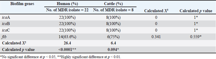 Table 4. Percentage of biofilm genes of MDR S. aureus isolated from human and cattle urine samples according to PCR technique.