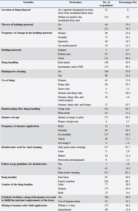 AbstractBackground: Manure waste disposal is an essential aspect of dairy farm biosecurity and significantly impacts farm productivity, animal health, public health, and environmental sustainability. Improper manure management can contribute to pathogen spread, groundwater contamination, and environmental pollution, necessitating targeted interventions. Aim: This study aimed to explore the perceptions, practices, needs, and challenges faced by dairy farmers in Punjab in relation to manure management and its broader implications. Methods: A cross-sectional survey was conducted among 275 dairy farmers in Punjab using a structured questionnaire. The questionnaire included closed-ended, Likert scale-based, and open-ended questions addressing key aspects of manure management. Data were analyzed to explore associations between demographic factors (gender, age, education, herd size) and manure management practices. Results: The analysis revealed that most respondents (66.9% strongly agreed, 33.1% agreed) recognized manure as an effective fertilizer. However, 43.6% strongly disagreed that dung odor should be considered a source of environmental contamination or health concern, and only 47.3% linked manure to pathogen spread. The opinions on groundwater contamination were divided, with 41.1% agreeing and 43.6% strongly disagreeing. Risk practices identified included 92% of farmers storing dung within residential areas and 50.9% handling dung barehanded. Significant associations were observed between demographics and perceptions/practices, with higher education and larger herd sizes positively influencing adherence to proper manure management practices. The farmers emphasized the need for subsidies and training to improve their manure management practices. Conclusion: The study highlights gaps in manure management practices among dairy farmers and underscores the need for targeted interventions, policy support, and awareness campaigns. Strengthening sustainable manure management through collaboration with farmers, extension agencies, researchers, and policymakers, along with innovative approaches, is essential for enhancing farm biosecurity, safeguarding animal, and public health, and ensuring agricultural sustainability. Keywords: Biogas, Cattle, Dairy, Farm biosecurity, Manure, Pathogens. IntroductionThe dairy industry is fundamental to India’s agricultural sector, and it contributes significantly to rural livelihoods and the national economy. With a milk production of 14 million tons in 2023–2024, Punjab accounts for approximately 5.9% of India’s total milk output (BAHS, 2024). Modern dairy farming is primarily operated under intensive confinement systems where cows are milked one to three times daily. To maintain hygiene standards and minimize the risk of udder infections, routine cleaning of dairy sheds is typically performed at least twice daily, commonly after each milking session. This regular cleaning schedule is essential to ensure a clean environment between milking sessions and to support optimal udder health and milk quality. However, improper or unregulated waste disposal from these operations poses serious threats to animal and public health and the environment (Gržinić et al., 2023). The indiscriminate discharge of dung and wastewater can contaminate the farm environment, clog drainage systems, and pollute nearby rivers and water bodies. Further, the stagnant water created by blocked drains fosters mosquito breeding, elevating the risk of vector-borne diseases and releasing unpleasant odors into the community. Additionally, the decomposition of dung produces gases such as carbon dioxide, ammonia, hydrogen sulfide, and methane, which contribute to air pollution, odor issues, and greenhouse gas emissions, thereby exacerbating climate-related concerns (Ministry of Environment, Forest and Climate Change, 2020). Addressing these challenges necessitates the development and implementation of comprehensive farm waste management systems that integrate multiple strategies, including composting manure solids, employing anaerobic digestion to produce biogas, adopting precision nutrient management, and implementing effective wastewater treatment, to minimize environmental impacts and enhance resource efficiency (Bai et al., 2017; Gyadi et al., 2024). Utilizing livestock manure as a fertilizer is a well-documented practice, valued for its high nutrient and moisture content (Ayamba et al., 2021). This approach can reduce the dependency on chemical fertilizers and decrease the need for irrigation for crop production (Khan et al., 2022). However, when not properly managed, manure can lead to significant environmental degradation, affecting soil, water, and air quality (Erisman et al., 2008). Pathogens in livestock manure, such as Salmonella spp., Campylobacter spp., Listeria monocytogenes, Yersinia enterocolitica, Escherichia coli, Cryptosporidium parvum, and Giardia lamblia, pose animal and public health risks (Pachepsky et al., 2006). The microorganisms are often shed asymptomatically in the manure of infected animals and may contaminate the environment if manure is inadequately managed (Doyle and Erickson, 2006). The survival rates of pathogens vary based on environmental conditions, with some pathogens persisting for extended periods (Wang et al., 2004). Strategies for pathogen inactivation include prolonged manure storage, composting, vermicompost, and anaerobic digestion (Dong et al., 2022). Effective manure management techniques such as piling and aeration create conditions that facilitate microbial degradation and pathogen reduction (Erickson et al., 2010; Chen and Jiang, 2014). High nutrient concentrations in the environment are linked to the excessive application of fertilizers and manure, intensive livestock farming, and suboptimal agricultural practices (Herrero and Gil, 2008). Effective manure management requires a holistic approach that incorporates both on-farm and off-farm s
