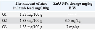 ABSTRACTBackground: Zinc oxide nanoparticles (ZnO NPs) have low toxicity and are utilized extensively in medicine. The properties of ZnO NPs include the promotion of growth, the modulation of the immune system, and the regulation of animal reproduction. Aim: An evaluation of the renal and hepatic function of lambs subjected to ZnO NP treatment. Methods: Fifteen apparently healthy local breed lambs, aged between 7 and 9 months, were utilized in the present study. The lambs were divided randomly into three equal groups. The control group (group I) received water and glycerol only, the treatment group (group II) received 3.5 mg/kg of ZnO NPs orally, and the third group (group III) received 7 mg/kg of ZnO NPs orally once daily for a period of 90 days. A comprehensive biochemical analysis encompasses a range of essential parameters, including aspartate aminotransferase (AST); alanine aminotransferase; alkaline phosphatase (ALP); serum creatinine; blood urea; and total serum bilirubin (TSB). Results: A significant increase in TSB was observed among the control group (I) in comparison with the initial baseline. Furthermore, a significant increase in TSB. was noted in group I when it was incorporated with groups II and III at the end of the study. A significant increase in serum AST and ALP was observed among groups I, II, and III at the study’s conclusion in comparison with the initial baseline. However, no significant changes were detected between these groups. Conversely, serum ALP values exhibited a significant decrease at the study’s conclusion in comparison with the baseline. There was a substantial increase in serum urea and creatinine levels at the end of the study in all groups when compared with the baseline. Conclusion: Due to the different results of toxicological studies on experimental animals. Current recommends carrying out more studies to clarify the toxic effects, in order to install the appropriate doses for animals to determine the desired benefit of nano-zinc to reach logical conclusions. Keywords: Kidney, Liver, Function, Lambs, Zinc oxide nanoparticles IntroductionIt is imperative to acknowledge the pivotal function of trace elements in sustaining optimal cell metabolism, thereby ensuring animal health and productivity (Bhalakiya et al., 2019). A deficiency in these elements has been demonstrated to induce perturbations in animal health and productivity. Consequently, the provision of trace elements as mineral supplements is essential to circumvent such deficiencies (Bhalakiya et al., 2019; Palomares, 2022). Nanotechnology encompasses the production, manipulation, and utilization of materials at the nanoscale level (Kavitha et al., 2013). Nanoparticles (NPs) are particles with a size ranging from 1 to 100 nanometers, and their use is particularly significant in the fields of medicinal chemistry, atomic physics, and other related disciplines (Jeevanandam et al., 2018). Nanomedicine involves the use of NPs as therapeutic targets, including drug delivery, with a particular emphasis on the central nervous system (Guo et al., 2023). The application of nanomedicine in imaging, diagnostics, and treatments for tissue damage has also been demonstrated (Wan et al., 2025). Zinc oxide NPs (ZnO NPs) have low toxicity and are utilized as antibacterial, anti-inflammatory, and anticancer agent, for drug transport, wound healing, and bioimaging (Xiong, 2013; Zhang and Xiong, 2015; Mishra et al., 2017). This chemical aids animal growth, immune system modulation, and reproduction. All doses of ZnO NPs have various effects on animal performance. However, in the absence of any indirect contamination of the environment, ZnO NPs are capable of replacing conventional zinc sources at smaller doses, with superior results (Rahman et al., 2022). Consequently, further research is necessary to ascertain the definite bioavailability of ZnO NP in animals (Partha and Somu, 2016). The objective of the present study is to evaluate the effect of ZnO NPs treatment of lambs on renal and hepatic functions, weight gain. Material and MethodsEthical considerationEthical Approval No.UOD-VMD-7 was granted by the ethical review committee of the Department of Internal Medicine at the College of Veterinary Medicine, University of Diyala, in Iraq. The area and the populationAccording to the local ethical legislations for University of Diyala, 15 apparently healthy local breed male lambs, with age range 7–9 months, living in the farm of Veterinary Medicine College, University of Diyala, Baqubah city, Diyala Governorate, 33°45’34.71”N; 44°36’23.97”E, Northeast were included (Al-Ezzy et al., 2016; Bak et al., 2024). Prior to the trial, biochemical testing of liver and kidney function was performed for all animals, along with an internal parasite investigation. Ivermectin and Oxyclozanid were administered to the lambs as preventative treatments at prescribed dosages of 0.2 and 15 mg/kg B.W., respectively, given twice at intervals of 2 weeks. According to the study by (Constable et al., 2017), a clinical evaluation of the animals’ mucous membranes, appetite, behaviors, and physical condition was carried out over the course of 2 weeks. Until the end of the experiment, lambs were given 500 g of barley grain per head per day along with straw, green feed, and water. Feed quantity and compositionThe feed quantity is 3% of the body weight, with two meals of concentrated feed, one in the morning and the other in the evening, and roughage (hay) is given freely. The result of the analysis of the feed sample for the zinc appeared the concentration:1.83 mg/100 g, according to (A.O.A.C., 2023). The components, energy content (kcal/kg dry matter) and crude protein percentage (%) of the feed used in the experiment were determined according to (Thiex et al., 2002), listed in Table 1. ZnO NPs analysisScanning electron microscopeMorphological specifications and size of ZnO NPs were defined according to (Shamhari et al., 201