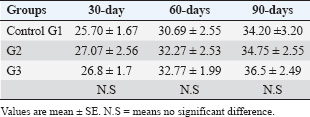 Statistical analysisAll data were denoted as means ± SE. One-ANOVA in SPSS was used for analysis (Hameed et al., 2020). Different letters were used to indicate significant differences at (p < 0.05) (Hussein et al., 2025). ResultsThe results did not show any abnormal clinical signs on the treated animals compared to the control animals, and all the clinical vital signs of the animals were normal. As shown in Table 3, the results of liver function in current study refer to that TSB significant increase in control group (I) at end of study in comparison with zero day, while, in treated groups (II, III) no significant changes at end of study in comparison with zero day, all so, in the between groups significant increase in group I incorporation with group II and III at end of study. The serum values of AST and ALP significantly increased in groups I, II, and III at the end of the study in comparison with zero day, but no significant changes between groups. The serum values of ALP showed significant decreased at end of study in comparison with zero day, While, between groups a significant increase in group I and II incorporation with group III at end of study. The results of serum value for BU showed no significant changes at end of study in comparison with zero day in all groups. The value of serum creatinine showed no significant changes at end of study in comparison with zero day (Table 3). The results of serum value for BU showed no significant changes at end of study in comparison with zero day in all groups. The value of serum creatinine showed no significant changes at the end of the study in comparison with zero day (Table 4). Table 4. Show kidney function parameters of control and treated groups.