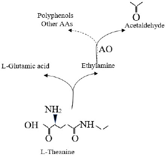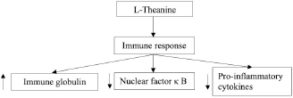 Fig. 2. Metabolism pathway of L-theanine (Liu et al., 2017). The Effect of L-theanine on the Immune ResponseFactors affecting immunityThere are various factors that affect animal immunity, and stress is the most dominant one. The increase in the poultry population to meet the demand of humans intentionally leads to stress conditions for poultry. The immune system’s performance may be compromised as a result of genetic immunological abnormalities or may develop as a result of the influence of numerous immunosuppressive stimuli on the animal organism. They may include germs, uncontrollable variables, primarily chemical contaminants, insufficient nourishment, and even unfavorable animal housing circumstances. There are three main factors that affect bird immunity: (1) bird genotype; (2) environmental stress; and (3) nutritive modification (Sosnówka-Czajka and Skomorucha, 2018). However, this study focuses on L-theanine as a nutritional factor in bird immunity because of the great function of L-theanine in enhancing immunity under stress conditions. Relationship between stress conditions and immune responseImmunity is classified into two categories: adaptive and innate immunity. Innate immunity is a type of nonspecific immunity that serves as the first line of defense in the phylum’s lower strata (Bagath and Sejian, 2018). The adaptive immune system is activated in response to the pathogen’s entrance. The adaptive immune system is classified into two distinct components: humoral-mediated immunity (HMI) and cell-mediated immunity (CMI). T-lymphocytes are critical in CMI, whereas B-lymphocytes are critical in HMI (Bagath and Sejian, 2018). In the case of heat stress, heat stress impairs both humoral and cellular immunities by lowering primary and secondary immunoglobulin synthesis and controlling the production of numerous anti-inflammatory and inflammatory cytokines, hence impairing normal immune function.