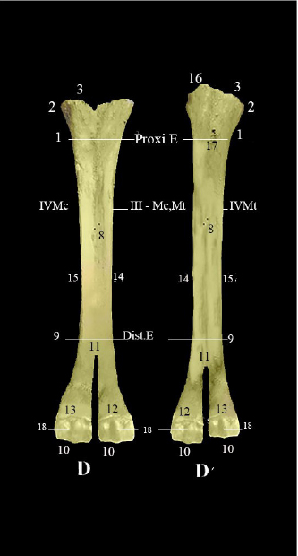 Fig. 4. (D) Palmer view of metacarpus, (Dʹ) planter view of metatarsus of female. Showing (1) proximal extremity of large metacarpus (III and IV Mc), (2) articular surfaces, (3) tuberosity of the third metacarpus, (4) dorsal longitudinal groove, (5) shaft of metacarpal bone (III Mc, IV Mc), (6) third metacarpus–metatarsus, (7) fourth metacarpus and fourth metatarsus, (8) nutrient foramens, (9) distal extremity of large metacarpus (III and IV Mc), (10) articular surfaces, (11) intertrochlear split, (12) medial condyle (13), lateral condyle (14) second metacarpus (II Mc)-metatarsus (II Mt), (15) fifth metacarpus (IV Mc)-metatarsus (IV Mt), (16) prominence process, (17) proximal canal, (18) inter-condyloid ridge. The distal extremity of the metacarpus of Mc III and IV (Figs. 1A; 2B; 3C; and 4D,9) are larger than the metatarsus bones and are situated on some level. The sagittal notch is intertrochlear split (Figs. 1A,11; 2B,11; 3C,11; and 4D,11) divided the distal extremity into two trochlea, each trochlea divides into two condyles (Figs. 1A; 2B; 3C; 4D, 12,13; and 5,3), each condyle is smooth dorsally and divides by the intercondylar ridge; palmary (Fig. 4D,18) into two area abaxial (Fig. 5,1) and axial areas (Fig. 5,2). The small metacarpal Mc II and V are represented by two ridges on either side of the palmar surface of the large metacarpal bones. The metatarsal bonesThe metatarsal bone (Figs. 1Aʹ; 2Bʹ; 3Cʹ; and 4Dʹ): is similar to the metacarpal bone. It had a quadrilateral form with four sides. There are four metatarsal bones: two long metatarsal bones, Mt (III and IV) (Figs. 1Aʹ,6,7; 2Bʹ,6,7; 3Cʹ,6,7; and 4Dʹ,6,7) fused except in the distal part where they were splay to form independent articulation surfaces for III and IV digits. The two bones were totally welded metatarsal bones, Mt II and V without details. The proximal articular surface of the metatarsal bones (Figs. 1Aʹ,3; 2Bʹ,2; 3Cʹ,3; 4Dʹ,3; and 5Aʹ) is characterized by a pointed process planetary (Figs. 3Cʹ,16 and 4Dʹ,16). It has two main bean-shaped facets for the tarsal articulation. The lateral one is the largest of the two surfaces, for articulation with the fourth tarsal bone (T4), while other facet is small oval surface, situated medially to articulate with the second tarsal bone (T2). The proximal articular surface of Mt III is slightly higher than that of Mt IV. The medio-planter facet on the proximal articular surface of Mt III articulates with the first tarsal bone planetary and the fused second and third tarsal and fourth bones (Figs. 1Aʹ,3; 2Bʹ,2; 3Cʹ,3; 4Dʹ,3; and 5Aʹ), while the proximal articular surface of Mt (I–IV) it articulates with (T4). The shaft of the metatarsus is slenderer and squarer in diameter. The Mt III has a prominent and large tuberosity proximo-laterally bones (Figs. 1Aʹ,2; 2Bʹ,3; 3Cʹ,2; and 4Dʹ2), as well as an extended raised area, while Mt IV has a minor tuberosity proximo-medially, as well as the rough oval area along the lateral face. The dorsal surface has a shallow vascular groove that is wider and deeper (Fig. 3Cʹ,4) than the dorsal groove of the metacarpus) which determines the line fusion between Mt III and IV bones. The planter surface is concave and flanked on each side by a rough border except in its distal part. It has the proximal foramen (Figs. 2Bʹ,17 and 4Dʹ,17) in the proximal extremity that passes obliquely to the proximal articular surface. Along the proximal two-thirds of the shaft, the lateral border is slightly concave. It thins out and becomes a rounded border. The medial border of the metatarsal bone at the proximal half is oblique, flattened, and rectangular, it becomes slenderer and has a rounded border distally.