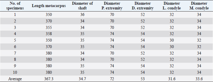 The one-humped camels’ metacarpus-metatarsus were supplied by two nutrients arteries from common palmar-planter digital artery, which is a direct continuation of the median artery. The nutrient artery enters through two nutrient foramens proximal and distal nutrient arteries at the middle part of the bones where they lead into a nutrient canal. This canal extends into the bone body where it gives inside the bone metaphyseal artery to the shaft of the bone, and the epiphyseal artery to supply the spongy bones of the proximal and distal parts of the bones. DiscussionThe anatomical and physiological features of the camel adapt to extreme climatic desert environments (Al Juboori et al., 2010). It is necessary to understand the anatomy of the metacarpus and metatarsus in camels to recognize occurrences of lameness. This could be caused to anatomical flaws (Al-Ani, 2004; Gahlot, 2007). In the present study, the metacarpal and metatarsal bone was four in number, two large III and V which were quadrilateral in form, compressed from side to side, and two small fused metacarpal and metatarsal II and V which were in accordance to Smuts and Bezuidenhout (1987) and Al-Redah and Hussin (2016) in camel, Raghavan (1964) and Budras and Habel (2011) in ox, Yadav et al. (2015) in Indian spotted deer and Choudhary (2015) in blackbuck deer. In contrast to horse, Getty (1975) and Budras et al. (2013) who revealed that the metacarpal and metatarsal bones were three in number, one large III and two smalls were II and IV. The present study revealed that the metacarpus in camels consisted of the fusion of the Mc. III and IV, Fusion of two bones which extended along the whole length except at the distal end where they diverge forming V shape, this was in agreement with the report of Smuts and Bezuidenhout (1987) on camel. Table 3. Morphometric metacarpus of camel female.