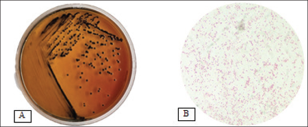 Fig. 1. (A) Salmonella sp. colony on SSA media. (B) Salmonella sp. morphology, showing a red color with a straight rod shape. Table 2. Antibiotic resistance in layer eggshells and native chickens.